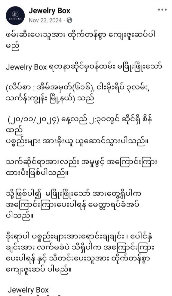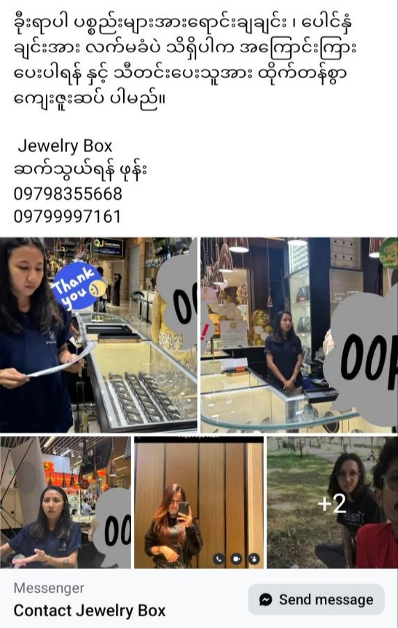 စိန်ဆိုင်ဝန်ထမ်းက ငွေကျပ် သိန်းသုံးထောင်နီးပါး GIA စစ်ချက်ပါရှိတဲ့ စိန်ထည် လက်ဝတ်ရတနာတွေ ခိုးယူထွက်ပြေးခဲ့တာကြောင့် စခန်းမှာ အမှုဖွင့်လှစ်ဆောင်ရွက်နေတဲ့အပြင် ဆုငွေပါထုတ်ပြီး ဖမ်းဆီးနိုင်ရေးကြိုးပမ်းခဲ့ Jewellery box စိန်ရတနာဆိုင်ရဲ့ ခိုးယူသူတရားခံတွေကို ဖေဖော်ဝါရီ ၇ ရက်နေ့ မနက်ပိုင်းက ရှမ်းပြည်နယ်ဘက်မှာ ပြန်လည်ဖမ်းဆီးရမိပြီဖြစ်တယ်လို့ ဒီကနေ့မှာ သူတို့ဆိုင်ရဲ့ လူမှုကွန်ရက်ကတစ်ဆင့် အသိပေးလာပါတယ်။