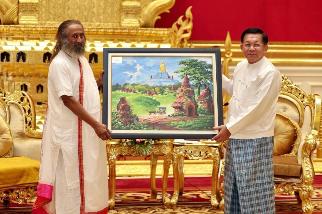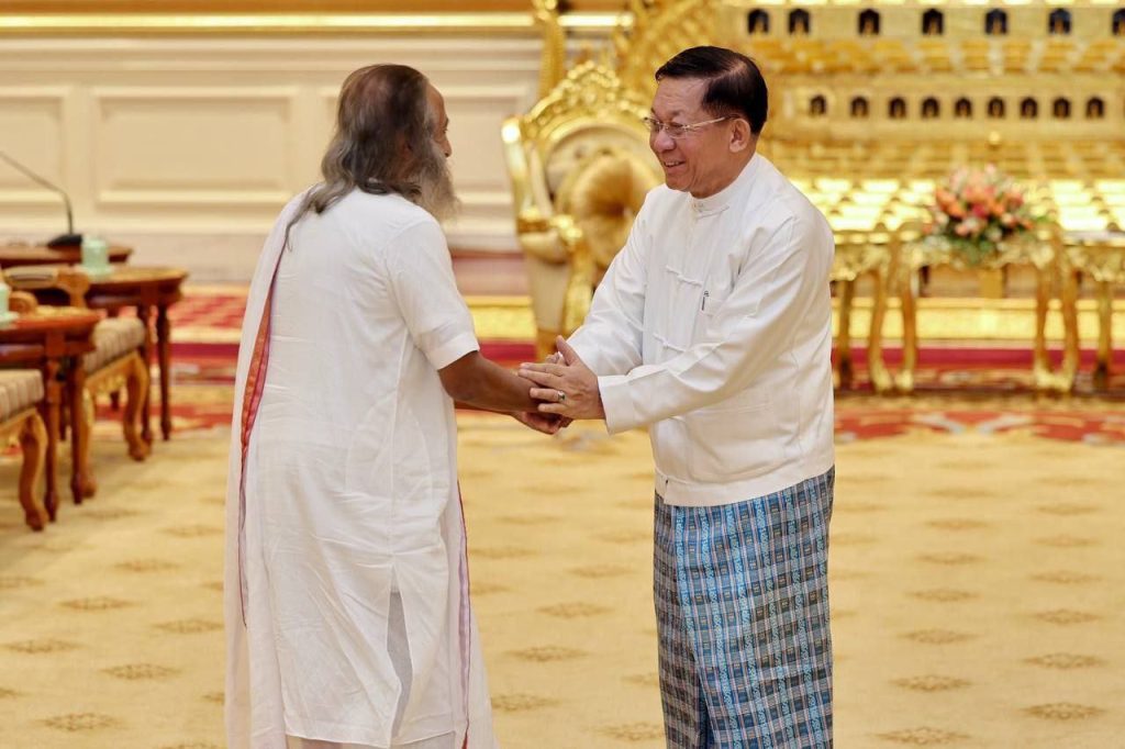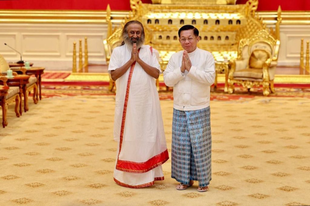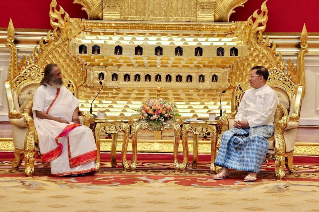 မြန်မာနိုင်ငံ၏ တည်ငြိမ်အေးချမ်းရေးအတွက် ကူညီဆောင်ရွက်ပေးနိုင်မှုအခြေအနေများအား နိုင်ငံတော်စီမံအုပ်ချုပ်ရေးကောင်စီ (SAC) ဥက္ကဋ္ဌ ဗိုလ်ချုပ်မှူးကြီးမင်းအောင်လှိုင်နှင့် အိန္ဒိယနိုင်ငံမှ လူသားချင်းစာနာထောက်ထားမှု ခေါင်းဆောင်နှင့် ငြိမ်းချမ်းရေးသံတမန်ကြီး Gurudev Sri Sri Ravi Shankar တို့သည် ယနေ့ နံနက်ပိုင်းတွင် နေပြည်တော်ရှိ နိုင်ငံတော်စီမံအုပ်ချုပ်ရေးကောင်စီ ဥက္ကဋ္ဌရုံး၊ သံတမန်ဆောင်ဧည့်ခန်းမ၌ တွေ့ဆုံဆွေးနွေးခဲ့သည်။
