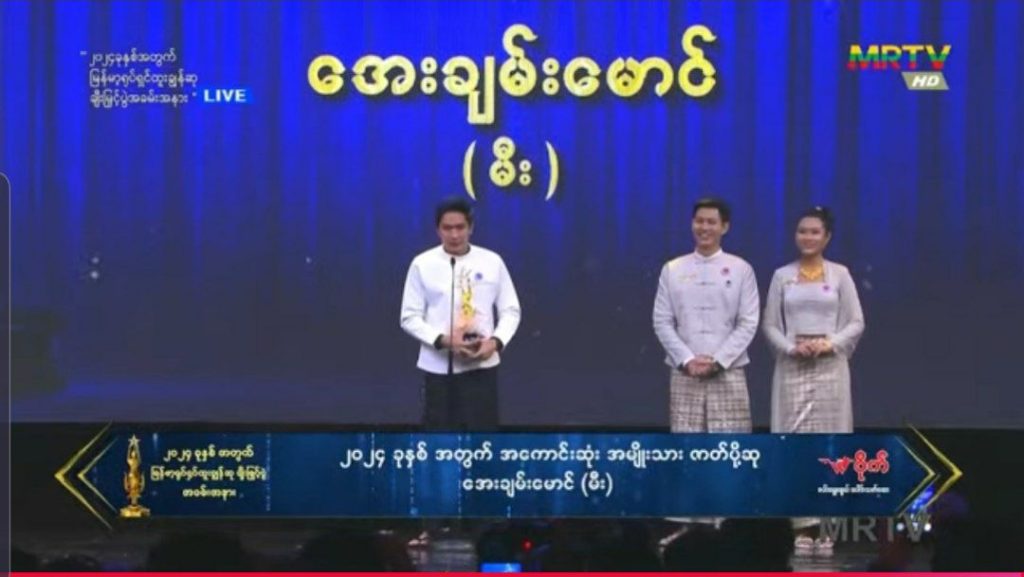 ယခု နေပြည်တော်မှာ ကျင်းပနေတဲ့ ၂၀၂၄ ခုနှစ်အတွက် မြန်မာ့ရုပ်ရှင်အကယ်ဒမီထူးချွန်ဆုပေးပွဲမှာ အကောင်းဆုံး အမျိုးသား ဇာတ်ပို့ဆုကို အေးချမ်းမောင်က မီးရုပ်ရှင်ဇာတ်ကားနဲ့ အကယ်ဒမီဆုကို ရရှိခဲ့ပါတယ်။