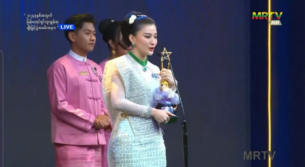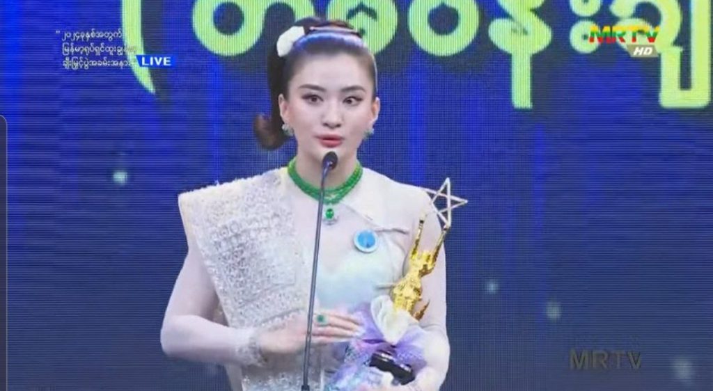 “နိုင်ငံတော်အကြီးအကဲများ အနုပညာဝါရင့်အနုပညာရှင်တွေ ကစ်ကို အားပေးနေကြတဲ့ပရိသတ်ကို ကျေး ဇူးတင်ပါတယ်။ နှစ်ဖက်မိဘတွေကိုလည်း ကျေးဇူးတင် ကန်တော့ပါတယ်။ ကစ် ၁၀ နှစ်နေမှ ပြန်ရလာတဲ့ဆုပါ။ တိမ်ပန်းချီရုပ်ရှင်ကို ကစ်ကို ယုံကြည်စွာလက်ခံပေးလို့လည်း ထုတ်လုပ်ရေးကို ကျေးဇူးတင်ပါတယ်။ ဒီကားမှာပါဝင်ပေးတဲ့ သရုပ်ဆောင်တွေ အားလုံးကို ကျေးဇူးတင်ပါတယ်။ ကစ်ကို မညည်းမညူလုပ်ပေးသူအားလုံးကို လုပ်ပေးလို့ ကျေးဇူးတင်ပါတယ်။ ကစ် ဒီကားရိုက်ချိန်မှာ ကစ် အဖေဆုံးခဲ့ပါတယ်။ ဒီဆုက ကစ် အဖေအတွက် ကစ် အနုပညာပြန်လုပ်ပြီး ဆုရစေချင်ခဲ့တာ အဖေပါ။ ဒီဆုက အဖေ့အတွက်ပါ။ ကစ်ချစ်တဲ့အနုပညာအလုပ်တွေ နားလည် စွာလုပ်ခွင့်ပေးတဲ့ ကစ်အမျိုးသားကိုလည်း ကျေးဇူးတင်ပါတယ် ”လို့ အကယ်ဒမီဝတ်မှုံရွှေရည်က ပြောပါတယ်။
