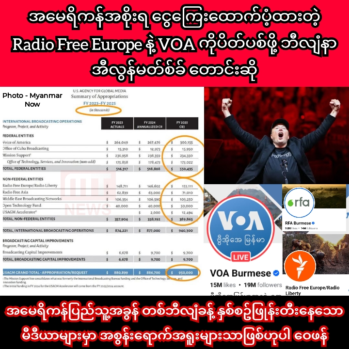 ယခုနှစ်အတွက် အသုံးစရိတ်များမှာ VOA သတင်းဌာနအတွက် ဒေါ်လာ သန်း ၃၀၀၊ RFE/RL သတင်းဌာနအတွက် ၁၅၃ သန်း ဖြစ်သည်ဟူသော USAGM အဖွဲ့၏ မှတ်တမ်းတစ်ခုတွင် တွေ့ရသည်။ ” လို့ ဖော်ပြခဲ့သလို ဒီအထဲမှာ မြန်မာတွေသိရှိတဲ့ RFA ကလည်း အမေရိကန်ထောက်ပံ့ခံမီဒီယာထဲပါဝင်နေပြီး ဒီနှစ်မှာ ဒေါ်လာ ၇၁ သန်းရမှာဖြစ်သလို ဒီမီဒီယာ ၇ ခုကို ဒီနှစ်ထောက်ပံ့စရိတ်က ဒေါ်လာ သန်း ၉၅၀ ရှိနေပါတယ်။
