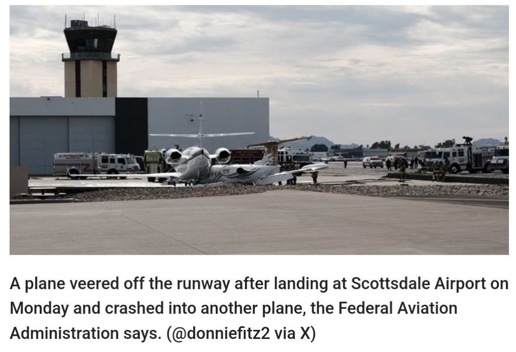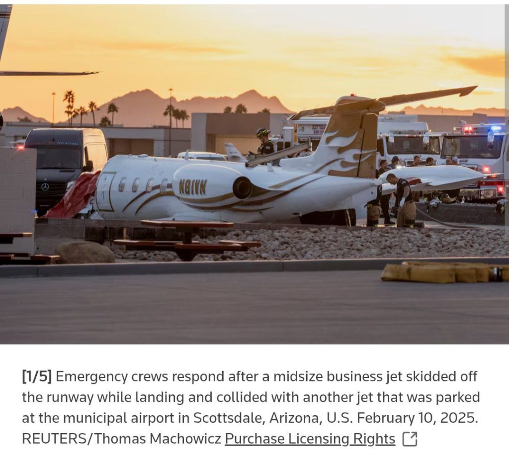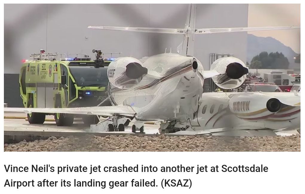 Motley Crue Band ရဲ့ ခေါင်းဆောင်အဆိုတော် Neil ပိုင်ဆိုင်တဲ့ Learjet aircraft Model 35A ဟာ မနေ့က ဒေသစံတော်ချိန် န်းလွဲ ၂ နာရီ ၃၉ မိနစ်မှာ အရီဇိုးနားပြည်နယ်၊ Scottsdale လေဆိပ်ကို ဆင်းသက်ချိန်မှာ ပြေးလမ်းအတိုင်း ပုံမှန်ဆင်းသက်လာနိုင်ခဲ့ပေမဲ့ ရုတ်ချည်းဆိုသလို ညာဘက်ကို လမ်းချော်သွားပြီး အခြားလေဆိပ်မှာရပ်ထားတဲ့ Gulfstream 200 လုပ်ငန်းသုံးလေယာဉ်ကို ဝင်တိုက်မိခဲ့တာ ရုပ်သံမှာ တွေ့ခဲ့ရတာပါ။