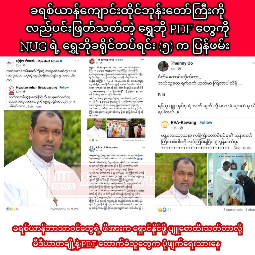 သတ်ဖြတ်ခံရတဲ့ ခရစ်ယာန်ဘုန်းကြီးရဲ့ လူအမည်က ရဲနိုင်ဝင်းဖြစ်ပြီး အသက်က ၄၄ နှစ်နဲ့ ခရစ်တော်မှာ အမှူထမ်းသက်က ၇ နှစ်ဖြစ်တဲ့ ဖာသာရ်ဒေါနယ်မာတင် (Fr. Donald Martin) ဟာ ကျင့်ဝတ်သိက္ခာနဲ့ ပြည့်စုံသလို PDF တွေက မူးယစ်သောက်စား လည်လှီးသတ်တာကြောင့် ဒီဖြစ်ရပ်ကို ပျူစောထီးတွေ ကျူးလွန်တာ၊ LPDF တွေ လုပ်တာပါလို့ NLD, NUG နဲ့ PDF ထောက်ခံသူတွေက ပုံဖျက်ရေးသား လှူံ့ဆော်မှုတွေလည်း လုပ်ဆောင်နေကြပါတယ်။