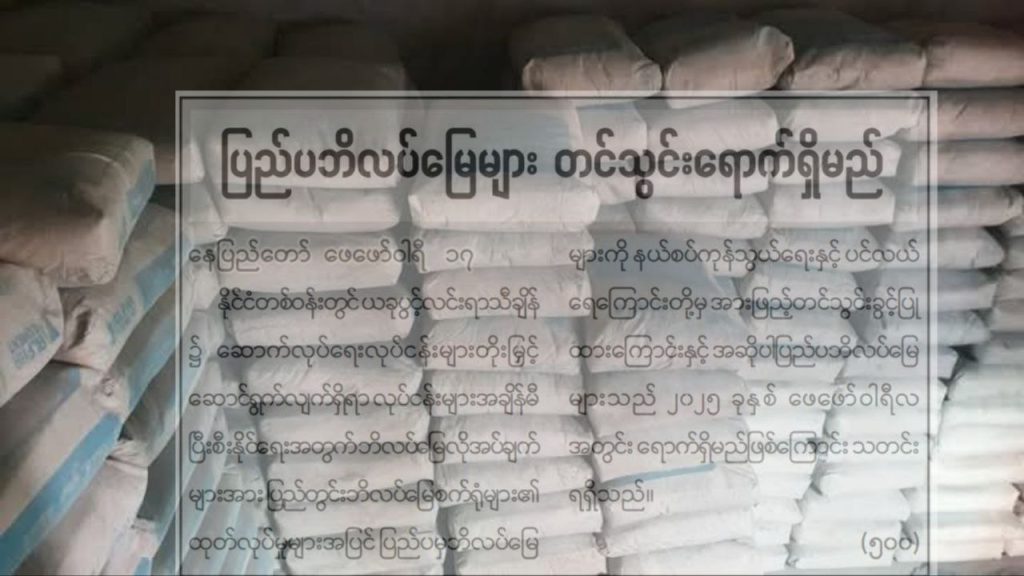 နိုင်ငံတစ်ဝန်းတွင် ယခုပွင့်လင်းရာသီချိန်၌ ဆောက်လုပ်ရေးလုပ်ငန်းများတိုးမြှင့် ဆောင်ရွက်လျက်ရှိရာ လုပ်ငန်းများအချိန်မီ ပြီးစီးနိုင်ရေးအတွက် ဘိလပ်မြေလိုအပ်ချက်များအား ပြည်တွင်း ဘိလပ်မြေစက်ရုံများ၏ ထုတ်လုပ်မှုများအပြင် ပြည်ပမှဘိလပ်မြေများကို နယ်စပ်ကုန်သွယ်ရေးနှင့် ပင်လယ်ရေကြောင်းတိုမှ အားဖြည့်တင်သွင်းခွင့်ပြုထားကြောင်းနှင့် အဆိုပါ ပြည်ပဘိလပ်မြေများသည် ၂၀၂၅ ခုနှစ် ဖေဖော်ဝါရီလအတွင်း ရောက်ရှိမည်ဖြစ်ကြောင်း ထုတ်ပြန်ထားသည်။