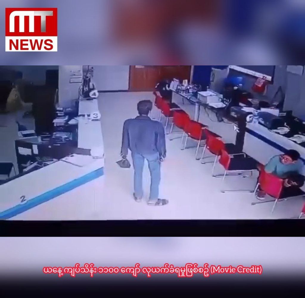 ဒီနေ့ ထပ်မံ ဓားပြတိုက်ခံရတဲ့ဖြစ်စဥ်မှာ ကမ္ဘောဇဘဏ် (၃၇)ကို နံပါတ်မပါတဲ့ စူပါကပ်ဆိုင်ကယ်နဲ့ မျက်နှာမှာ Mask တပ်ထားပြီး အင်္ကျီက ဂျင်းအပြာရင့်လက်ရှည်နဲ့ ဂျင်းဘောင်းဘီအပြာဖျော့ ဝတ်ဆင်ထားတဲ့ သက်လတ်ပိုင်း အမျိုးသားတစ်ဦးရောက်ရှိလာပြီး ဘဏ်အတွင်းဝင်ရောက်ကာ သေနတ်ပြချိန်းခြောက်ပြီး ဘဏ်ငွေလက်ခံဌာနက ကျပ်သိန်း ၁၁၅၀ ခန့်ကို လုံခြုံရေးကို ပီနံအိတ်နဲ့ ထုပ်ခိုင်းပြီး ဆိုင်ကယ်ခွကြားညပ်လို့ အသာအယာလုယက်သွားတာ တွေ့ရပါတယ်။