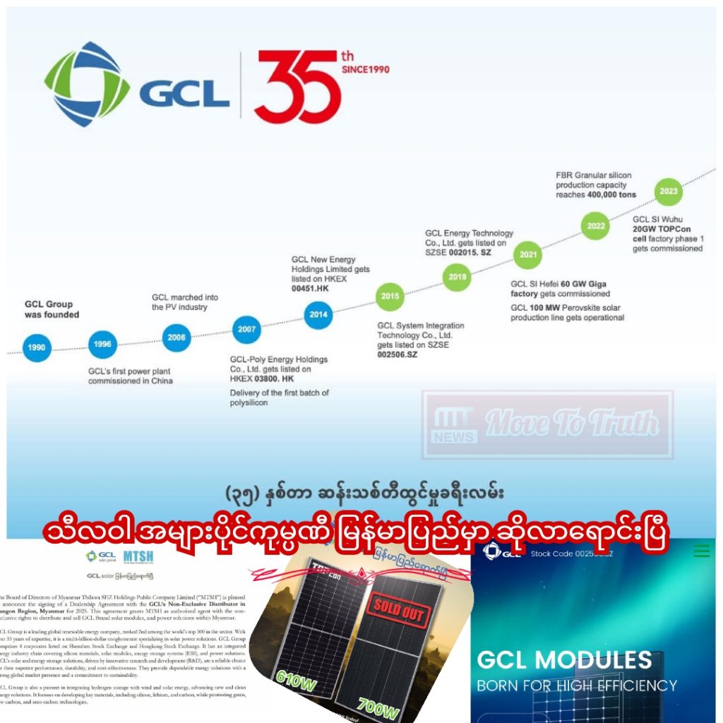 မြန်မာသီလဝါအက်(စ်)အီးဇက် ဟိုးဒင်းပတ်ဘလစ် အများနှင့်သက်ဆိုင်သောကုမ္ပဏီလီမိတက် (MTSH) ၏ ဒါရိုက်တာ အဖွဲ့အနေဖြင့် MTSH သည် ၂၀၂၅ ခုနှစ်အတွက် မြန်မာနိုင်ငံ၊ ရန်ကုန်တိုင်းဒေသကြီးရှိ GCL ၏ သီးသန့် မဟုတ်သော အရောင်းကိုယ်စားလှယ် (The Non-Exclusive Distributor) နှင့် အရောင်းကိုယ်စားလှယ် သဘောတူညီမှုစာချုပ်ကို လက်မှတ်ရေးထိုးခဲ့ပြီး ဤသဘောတူညီချက်အရ MTSH အား GCL အမှတ်တံဆိပ် Solar Modules (Solar Panels) များနှင့် Power Solutions များကို မြန်မာနိုင်ငံအတွင်း ဖြန့်ဖြူး ရောင်းချရန် ခွင့်ပြုလိုက်သည်ဟု သိရသည်။