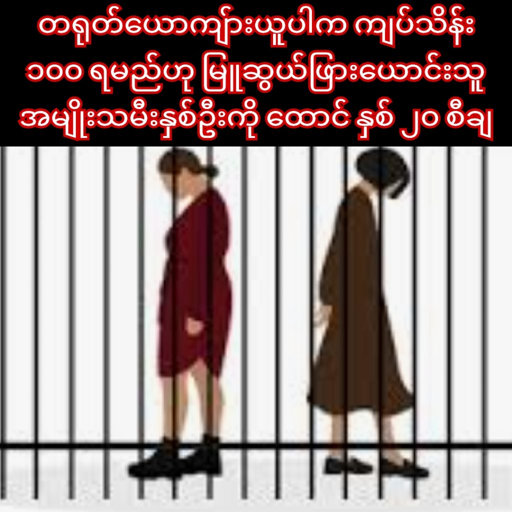တရုတ်ယောကျ်ားယူပါက ကျပ်သိန်း ၁၀၀ ရမည်ဟု မြူဆွယ်ဖြားယောင်းကာ အမျိုးသမီးနှစ်ဦးအား တရုတ်ပြည်ပို့ရန် ကြံစည်သူ အမျိုးသမီးများကို လူကုန်ကူးမှုဖြင့် အလုပ်နှင့် ထောင်ဒဏ် နှစ် (၂၀) စီကျခံစေရန် အမိန့်ချမှတ်ခဲ့ကြောင်း မြန်မာနိုင်ငံရဲတပ်ဖွဲ့မှ သိရသည်။