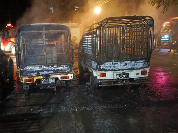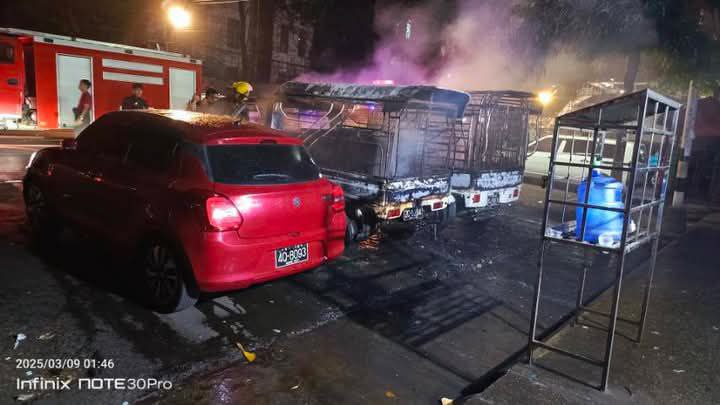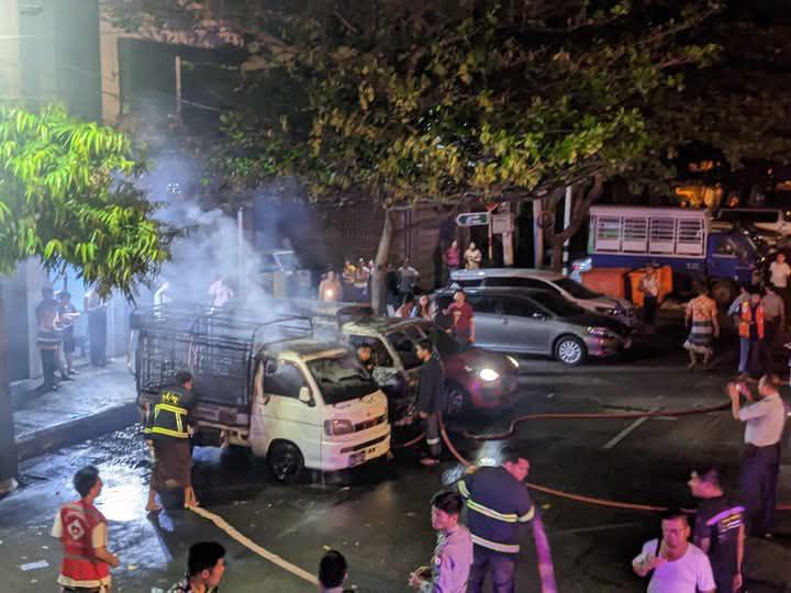 “ကားသုံးစီးမှာ Swift ကတော့ ထိတာနည်းတယ်။ Hijet နဲ့ Carry က ပိုများတာ။ နောက်ခန်းမှာဆို ပစ္စည်းတချို့လည်းရှိနေတော့ ပိုလောင်အားကောင်းသွားတာ။ ရပ်ထားတဲ့အချိန် လောင်တာ၊ ညဘက်လည်းဖြစ်နေတော့ ဖြစ်နိုင်ခြေတွေ စိစစ်နေတာပေါ့။ ကားသုံးစီးပေါင်းတန်ဖိုးက သိန်းထောင်ဂဏန်းရှိပါတယ်”လို့ မီးငြှိမ်းသတ်ရာမှာပါဝင်သူတစ်ဦးက မျက်မြင်တွေ့ရတဲ့ဖြစ်စဥ်အပေါ် ပြောပါတယ်။