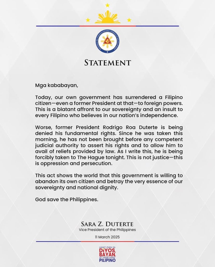 ဒီလိုမျိုး နိုင်ငံရေးလက်စားချေမှုအပေါ် သမ္မတဟောင်းဒူတာတေးရဲ့ သမီးဖြစ်သလို လက်ရှိ ဒုတိယသမ္မတလည်းဖြစ်တဲ့ ဆာရာဇီဒူတာတေးက ဖိလစ်ပိုင်ရဲ့ ဒုတိယသမ္မတအဖြစ် ပြည်သူကိုတိုင်တည်တဲ့ ကြေညာချက်ထုတ်ခဲ့ပြီး ဒီကြေညာချက်မှာ” ဒီနေ့မှာ ကျွန်ုပ်တို့ရဲ့ အစိုးရဟာ ဖိလစ်ပိုင်နိုင်ငံသားတစ်ဦးကို၊ထို့ထက်ပို၍ သမ္မတဟောင်းတစ်ဦးကိုပင် နိုင်ငံခြားသားအာဏာပိုင်များထံ လက်လွှတ်လိုက်ပါတယ်။ ဒါဟာ ကျွန်ုပ်တို့ရဲ့ အချုပ်အခြာအာဏာကို ထိပါးစေတဲ့ ရှင်းလင်းသော လုပ်ရပ်တစ်ခုဖြစ်ပြီး ကျွန်ုပ်တို့နိုင်ငံရဲ့ လွတ်လပ်ရေးကို ယုံကြည်သူ ဖိလစ်ပိုင်နိုင်ငံသား တစ်ဦးချင်းစီတိုင်းအတွက် စော်ကားမှုတစ်ရပ်ပင် ဖြစ်ပါတယ်။