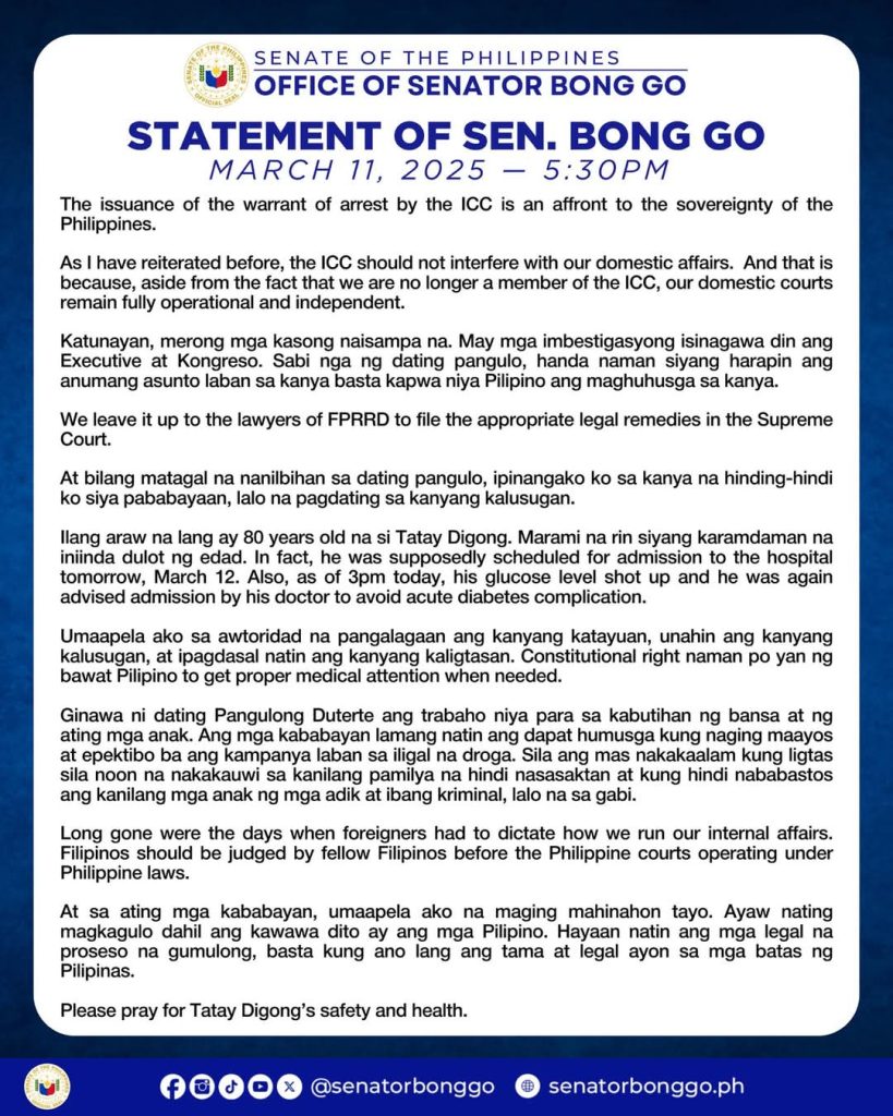 ဆီးချိုရောဂါ ခံစားနေရတဲ့ ဒူတာတေးကို ICC ကို ပို့တဲ့ မားကို့စ်ဂျုနီယာရဲ့ လုပ်ရပ်အပေါ် ဖိလစ်ပိုင်ပြည်သူလူထုက အုံကြွဆန္ဒပြနေသလို အထက်လွှတ်တော်အမတ် ဘွန်ဂိုက ဆန္ဒပြနေတဲ့ လူထုကြားကနေ မျက်ရည်တွေကျဆင်းနေရင်း တိုင်းပြည်ကောင်းကျိုးအတွက် လုပ်ဆောင်ခဲ့တဲ့ ဒူတာတေးကို ICC က စွက်ဖက် ဖမ်းဆီး စီရင်တာ ဝမ်းနည်းကြောင်း၊ယခင်အစိုးရလက်ထက်က မူးယစ်ဆေးဝါး တိုက်ဖျက်ရေး လှုပ်ရှားမှုရဲ့ အကျိုးသက်ရောက်မှုကို ဖိလစ်ပိုင်ပြည်သူတွေ ကိုယ်တိုင် ဆုံးဖြတ်သင့်ကြောင်း ပြောခဲ့သလို ဖိလစ်ပိုင်ရဲ့ အချုပ်အခြာအာဏာကို စွက်ဖက်တဲ့ ICC အပေါ် ရှုတ်ချကြောင်းလည်း ထုတ်ပြန်ခဲ့ပါတယ်။