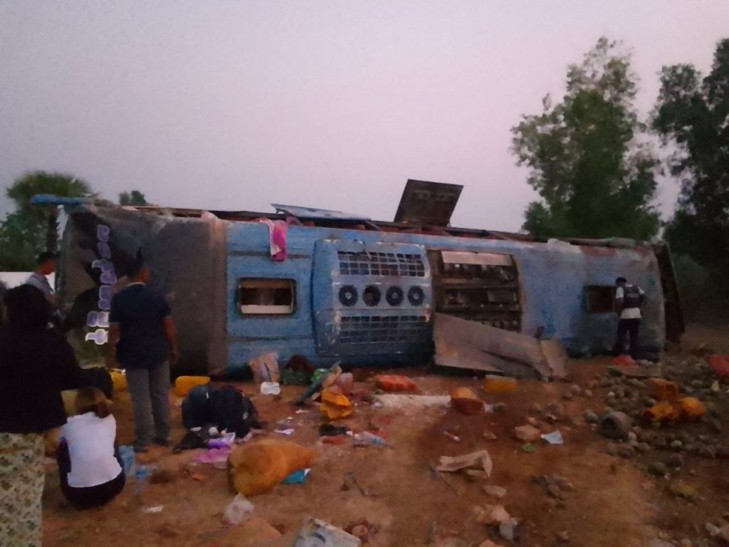 မနော်တံခွန် Express အပြာရောင်ခရီးသည်တင်ယာဥ်ပေါ်တွင် ယာဥ်မောင်း၊ ယာဥ်နောက်လိုက်အပါအဝင် အမျိုးသား ၇ ဦး၊ အမျိုးသမီး ၅ ဦး၊ကလေးငယ် ၁ ဦးစုစုပေါင်း ၁၃ ဦးလိုက်ပါလာကာ ဆန်၊ ကြက်သွန်နီ၊ ကြက်သွန်ဖြူအိတ်များတင်ဆောင် မောင်းနှင်လာစဥ် လမ်းခုလတ်၌ အရှိန်လွန်တိမ်းမှောက်ခဲ့ခြင်းဖြစ်ကြောင်း သိရသည်။