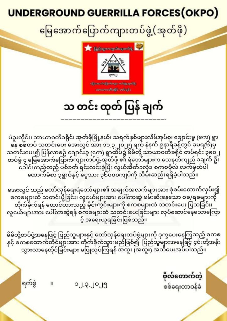 အုတ်ဖိုမြို့နယ်၊ ချောင်းခွ(ကေ) ရွာနေ လက်နက်မဲ့အမျိုးသားတစ်ဦးကို သတင်းပေးဟုဆိုကာ အုတ်ဖို PDF အဖွဲ့က သတ်ဖြတ်လိုက်ပြီး ပါလာသော ငွေ ၃၈၀၀၀ ကျပ်ကို လုယက်သိမ်းယူမှု ကျူးလွန်ခဲ့သည်ဟု ကျူးလွန်ခဲ့သည့် NUG ဩဇာခံ PDF များ၏ တော်လှန်ရေးအမည်ခံ ပြစ်ဒဏ်ကျူးလွန်မှုဝန်ခံချက်အရ သိရသည်။
