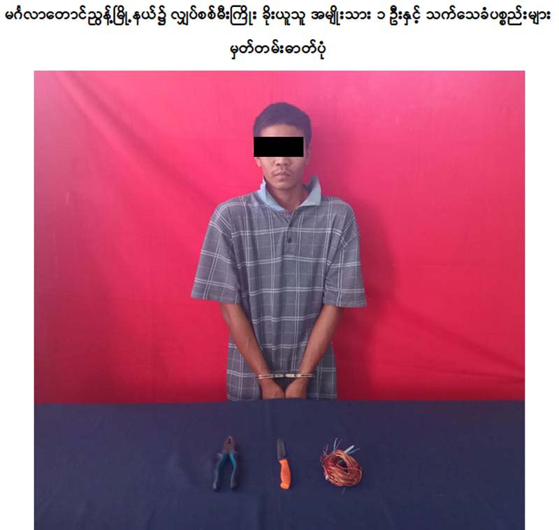 ရန်ကုန်တိုင်းဒေသကြီး၊ မင်္ဂလာတောင်ညွန့်မြို့နယ်၌ ရထားတွဲပေါ်က လျှပ်စစ်မီးကြိုးဖြတ်တောက် ခိုးယူသူ အမျိုးသား ၁ ဦးအား ဖမ်းဆီးအရေးယူထားကြောင်း သိရသည်။