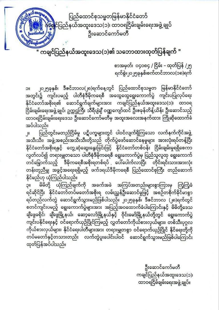 ◾ လက်နက်ကိုင်တိုက်ပွဲများနှင့် ဆူပူအကြမ်းဖက်မှုများ လုပ်ဆောင်နေကြသည့် တိုင်းရင်းသားလက်နက်ကိုင်များနှင့် သက်ဆိုင်ရာ အဖွဲ့အစည်းများ၊ ပတ်သက်သူများကိုလည်း ပြည်သူများ ဒုက္ခရောက်စေပြီး နိုင်ငံကို အန္တရာယ်ကျရောက်စေမည့် လုပ်ရပ်များကို နိုင်ငံနှင့်ပြည်သူအကျိုးရှေးရှု၍ ရပ်တန့်ပေးကြရန်ပါ အသိပေး