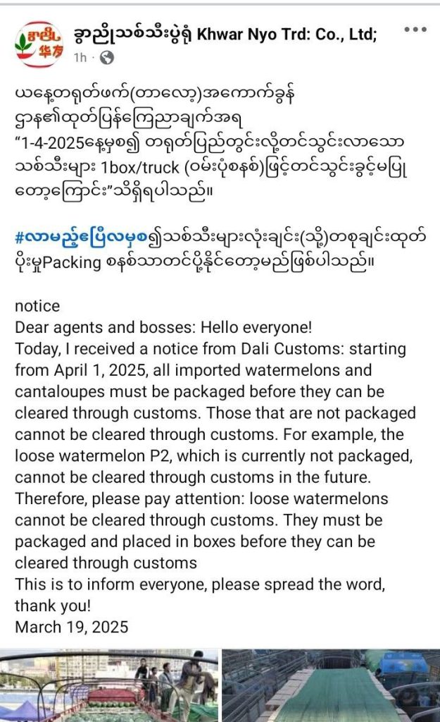 တရုတ်နိုင်ငံ (တာလော့)အကောက်ခွန်ဌာန၏ ယနေ့ ထုတ်ပြန်ကြေညာချက်အရ ၂၀၂၅ ခုနှစ် ဧပြီ ၁ ရက်မှစ၍ တရုတ်ပြည်တွင်းသို့ တင်သွင်းသော သစ်သီးများကို 1box/Truck (ဝမ်းပုံစနစ်)ဖြင့် တင်သွင်းခွင့်မပြုတော့ကြောင်း မူဆယ်ကုန်သွယ်ရေးဇုန်အခြေစိုက် ခွာညိုသစ်သီးပွဲရုံမှ အသိပေးထားသည်။