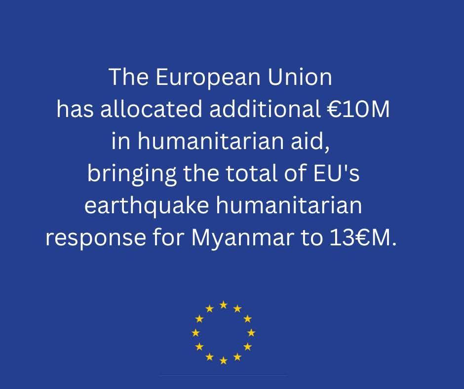 မတ်လ ၂၈ ရက်က မြန်မာနိုင်ငံနှင့် အနီးအနားဒေသတဝိုက်တွင် လှုပ်ခတ်ခဲ့သော ပြင်းအား ၇ ဒသမ ၇ အဆင့်ရှိ မြေငလျင်ကယ်ဆယ်ရေးလုပ်ငန်းများနှင့် စပ်လျဥ်း၍ ဥရောပကော်မရှင်သည် လူသားချင်းစာနာထောက်ထားမှုအကူအညီ နောက်ထပ် ယူရို ၁၀ သန်းကို ထပ်ဆောင်းပံ့ပိုးလိုက်သည်။