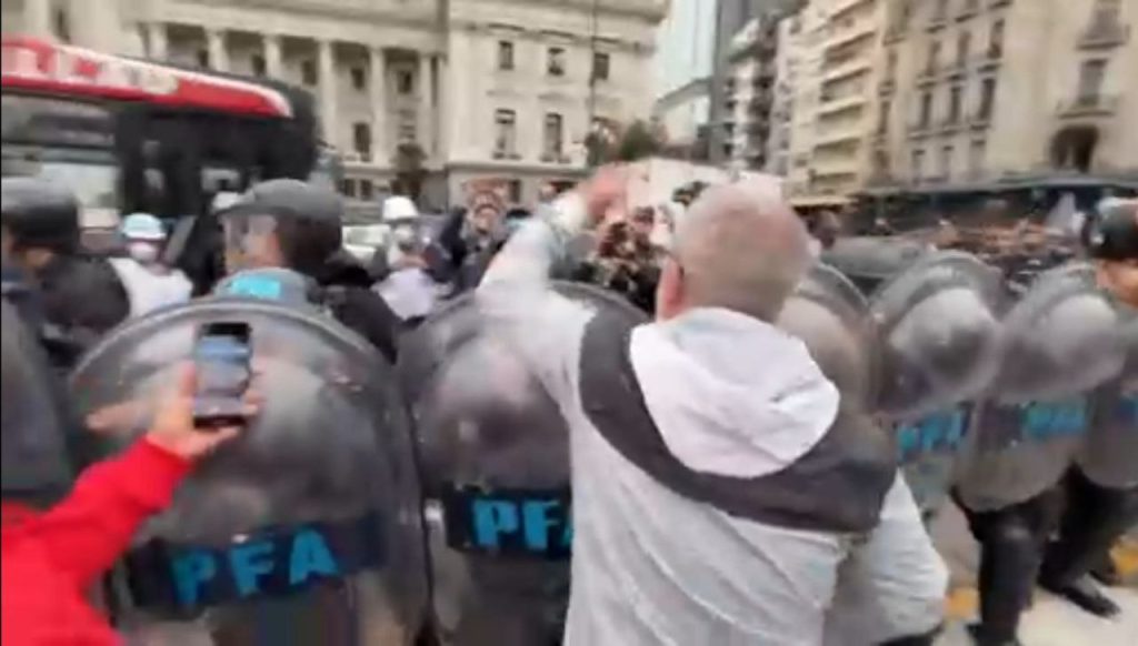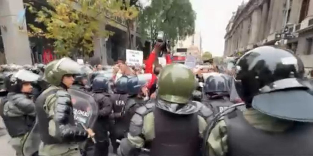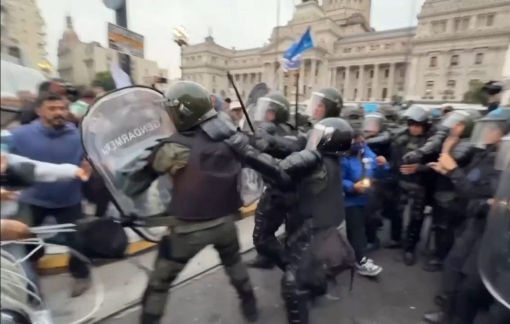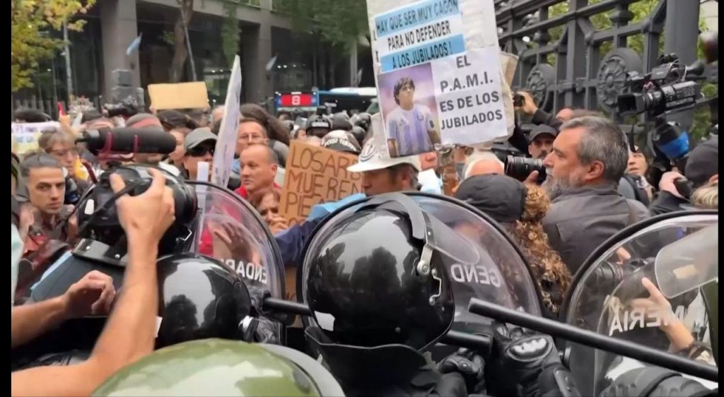 အာဂျင်တီးနားနိုင်ငံ၊ မြို့တော် ဗျူနိုအေးရီးစ်မှာ အငြိမ်းစားယူထားသူတွေရဲ့ အပတ်စဉ်ဆန္ဒပြမှုအတွင်း သူတို့က ကွန်ဂရက်လွှတ်တော်အနီး ယာဉ်အသွားအလာကို ပိတ်ဆို့ဖို့ကြိုးစားခဲ့ကြရာကနေ အဓိကရုဏ်းထိန်းရဲတပ်ဖွဲ့ဝင်တွေနဲ့ တင်းမာမှု အခြေအနေတစ်ရပ် ဧပြီလ ၁၆ ရက်က ဖြစ်ခဲ့ရတယ်လို့ သိရပါတယ်။