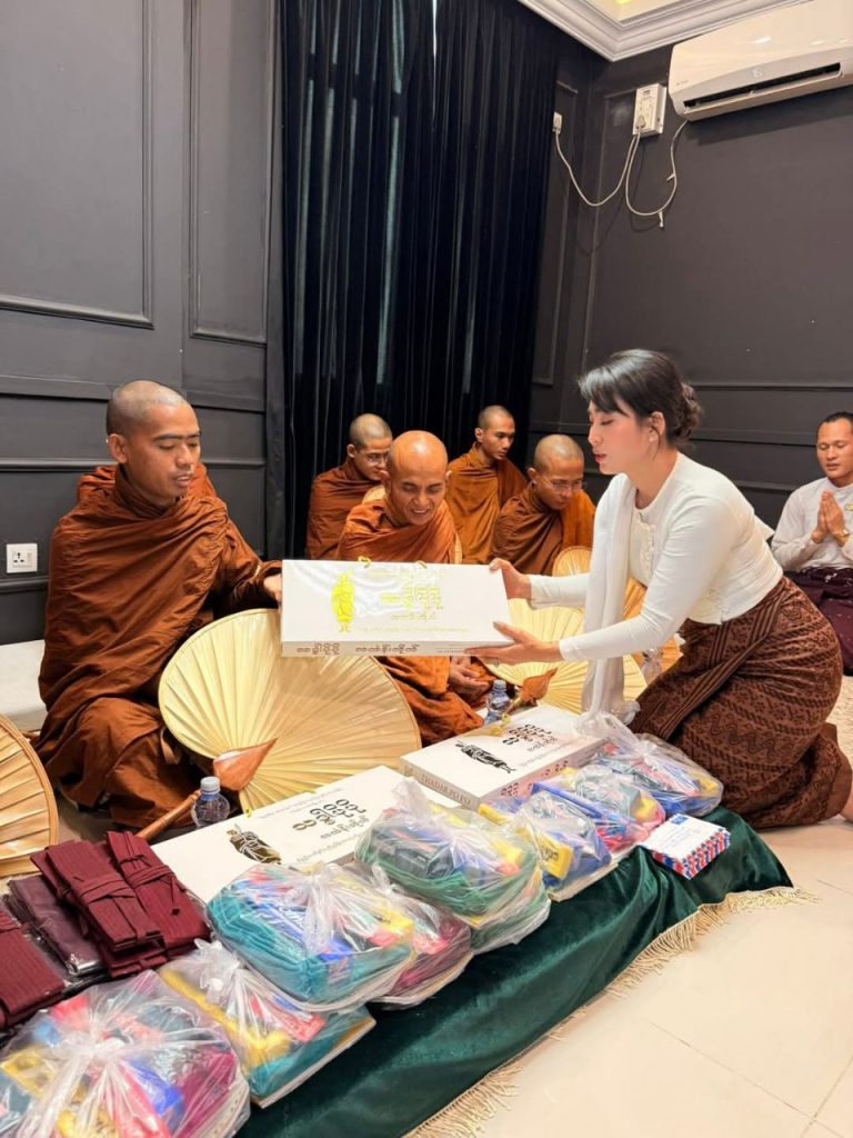 သူမကတော့ မြန်မာပြည်သူ ပြည်သားတွေ ငလျင်ဘေးသင့်ကာလအတွင်းမှာ ရေသန့် ၊ ဆေးဝါး၊ အဝတ် အထည်၊ ခေါက်ဆွဲခြောက်၊ အသင့် စားမုန့် စတာတွေကို ဆက်တိုက်ဆိုသလို နေပြည်တော်၊ ပျဉ်းမနား၊ စစ်ကိုင်း၊ မန္တလေး၊ အင်းလေး၊ ကလော၊ ပလိပ်၊ ရမည်းသင်း၊ ပျော်ဘွယ် စတဲ့နေရာတွေကို စေတနာရှင် ခုနစ်ရက် သားသမီးတွေနဲ့အတူ လှူဒါန်းပေးနေလျှက်ရှိပါတယ်။