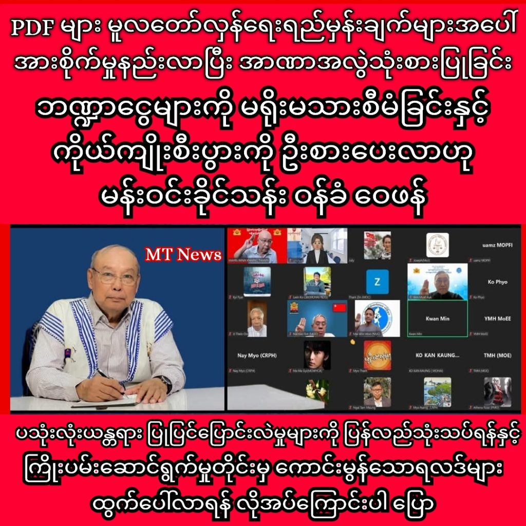 PDF များ မူလတော်လှန်ရေးရည်မှန်းချက်များအပေါ် အားစိုက်မှုနည်းလာပြီး အာဏာအလွဲသုံးစားပြုခြင်း၊ ဘဏ္ဍာငွေများကို မရိုးမသားစီမံခြင်းနှင့် ကိုယ်ကျိုးစီးပွားကို ဦးစားပေးလာခြင်းများ တွေ့ရှိရသည်ဟု NUG က ယနေ့ပြုလုပ်သည့် ကြားကာလဒေသန္တရပြည်သူ့အုပ်ချုပ်ရေးဖော်ဆောင်မှု ဗဟိုကော်မတီ အစည်းအဝေး အမှတ်စဉ်(၁၅/၂၀၂၅) တွင် ဗဟိုကော်မတီ ဥက္ကဋ္ဌ ပြည်ထောင်စုဝန်ကြီးချုပ် မန်းဝင်းခိုင်သန်းက ထုတ်ဖော်ဝန်ခံလိုက်သည်။