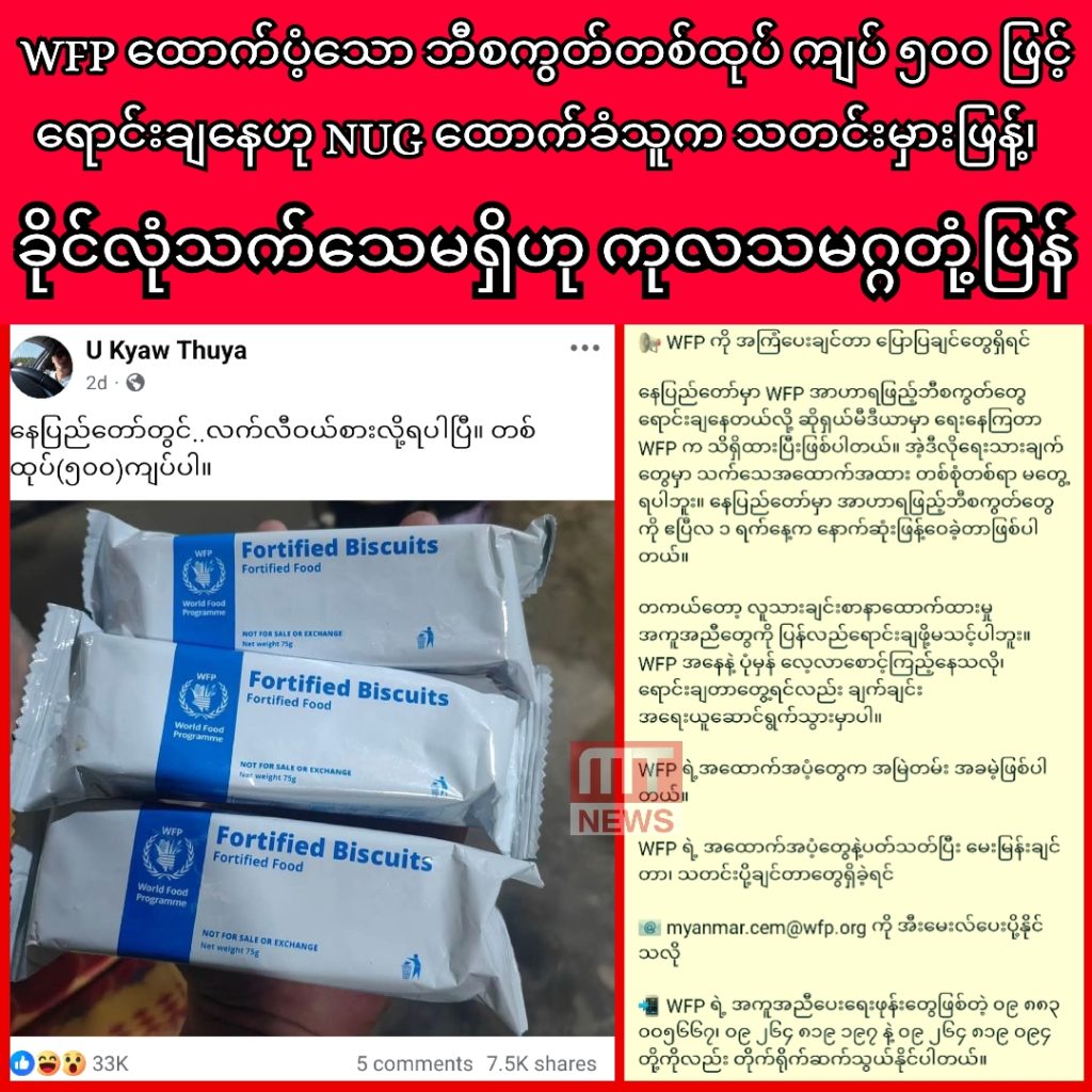 ပြီးခဲ့တဲ့ ရက်ပိုင်းအတွင်းမှာ တပ်မတော်ကို အမြဲတမ်းတိုက်ခိုက်နေပြီး CRPH, NUG, PDF နဲ့ EAOs တွေကို ထောက်ခံတဲ့ U Kyaw Thuya အမည်နဲ့ Facebook သုံးစွဲသူက WFP ဘီစကွတ်ပုံတင်ပြီး “နေပြည်တော်တွင်..လက်လီဝယ်စားလို့ရပါပြီ။ တစ်ထုပ်(၅၀၀)ကျပ်ပါ။”လို့ ခေါင်းစဥ်တပ် မျှဝေခဲ့တာပါ။ ဒီလိုသတင်းမှားဖြန့်မှုကို CRPH, NUG, PDF နဲ့ EAOs တွေကို ထောက်ခံတဲ့ မသိနားမလည်သူတွေက Like, Share, React ထောင်သောင်းချီပေးခဲ့ကြတာပါ။