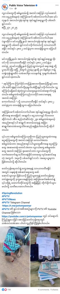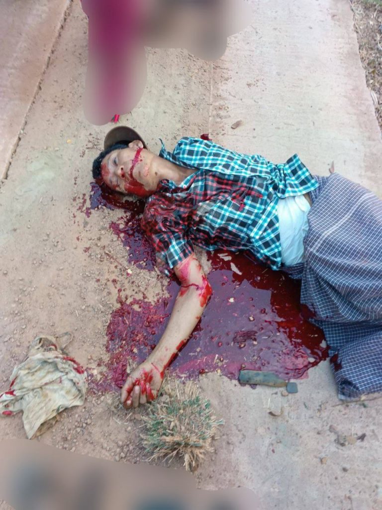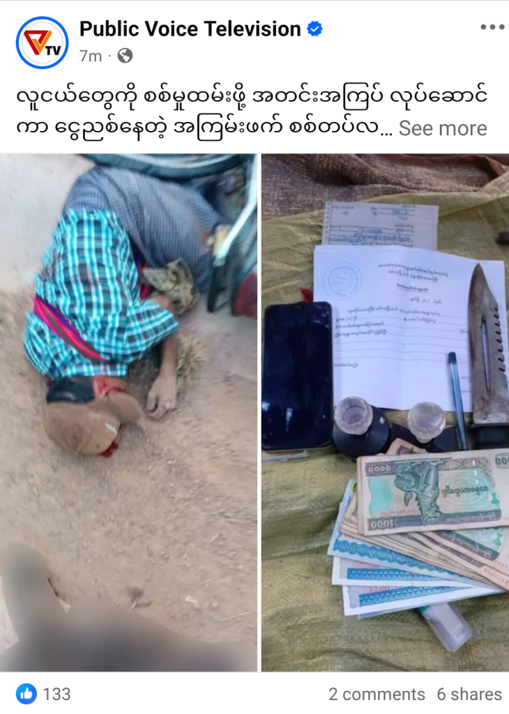 ဓားမြောင်သာကိုင်ထားတဲ့ ပဲခူးတိုင်း၊ မင်းလှမြို့နယ် အလယ်ကုန်းအုပ်စု အုပ်ချုပ်ရေးမှူးကို PDF သုံးဖွဲ့ပေါင်းပြီး သေနတ်နဲ့ငါးချက် ပစ်သတ်လိုက်တယ်လို့ NUG ရဲ့ PVTV သတင်းဌာနက ကျူးလွန်သူ PDF တွေရဲ့ ပြောဆိုချက်သုံးပြီး သတ်ဖြတ်ခံထားရသူပုံနဲ့တကွ သတင်းဖော်ပြလာပါတယ်။
