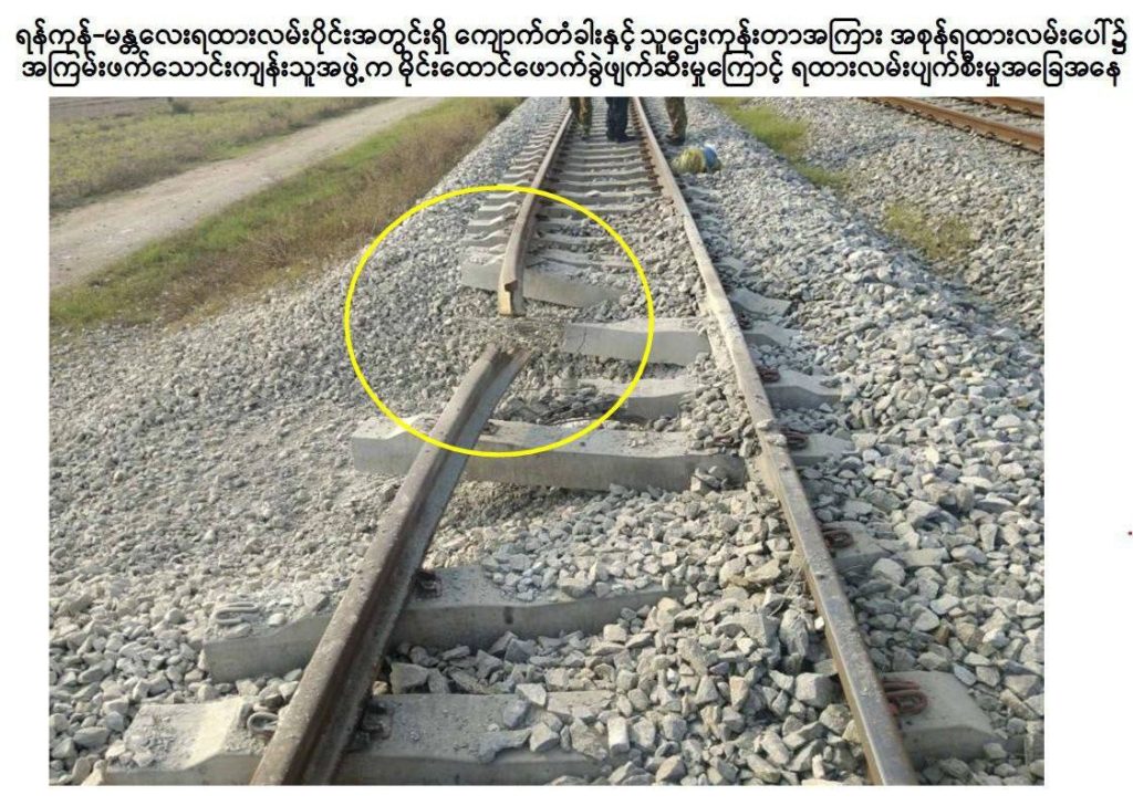 အကြမ်းဖက်သောင်းကျန်းသူများက မီးရထားလမ်းပိုင်းတွင် ဗုံးခွဲမှု ၂၇၂ ကြိမ် ကျူးလွန်ထားပြီးဖြစ်ပြီးယမန်နေ့ နံနက် ၇ နာရီအချိန်ကလည်း ကျောက်တံခါးဘူတာမှ ထွက်ခွာလာသော အမှတ်(၉၀၂)အစုန်ကုန် ရထားသည် ရန်ကုန်-မန္တလေး ရထားလမ်းပိုင်းအတွင်းရှိ ပဲခူးတိုင်းဒေသကြီး၊ ကျောက်တံခါးမြို့နယ်၊ ကျောက်တံခါးဘူတာနှင့် သူဌေးကုန်းဘူတာအကြား၊ မိုင်တိုင် အမှတ် ၁၀၇/၄-၅ နေရာသို့ ရောက်ရှိချိန် တွင် အစုန်ရထားလမ်းပေါ်၌ အကြမ်းဖက်သောင်းကျန်းသူအဖွဲ့က ထောင်ထားသည့် မိုင်းပေါက်ကွဲမှုကြောင့် အစုန်ရထားလမ်း ထိခိုက်ပျက်စီးနေကြောင်းတွေ့ရှိရသဖြင့် ကျောက်တံခါးဘူတာသို့ ပြန်လည်ဆုတ်ခွာခဲ့ရပြီး ကျောက်တံခါးနှင့် သူဌေးကုန်းရထားလမ်းပိုင်းအား နံနက် ၇ နာရီ ၂၆ မိနစ် အချိန်တွင်ယာယီပိတ်ထားခဲ့ရကြောင်း သတင်းရရှိသည်။