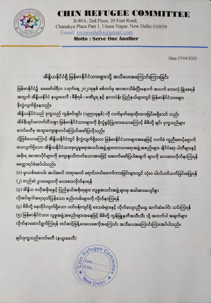 သို့ဖြစ်သောကြောင့် အိန္ဒိယနိုင်ငံတွင် ခိုလှုံလျက်ရှိသော မြန်မာနိုင်ငံသားများအနေဖြင့် လက်ခံကူညီစောင့်ရှောက်ပေးလျက်ရှိသော အိန္ဒိယနိုင်ငံသားမှလူမှုရေးအသင်းအဖွဲ့များ၊ ဘာသာရေးအဖွဲ့အစည်းများ၊ နိုင်ငံရေးပါတီများနှင့် အစိုးရအာဏာပိုင်များကို ကျေးဇူးသိတတ်သောအားဖြင့် (၁) မူးယစ်ဆေးဝါး အပါအဝင် တရားမဝင် ရောင်းဝယ်ဖောက်ကားခြင်းများတွင် လုံးဝ ပါဝင်ပတ်သက်ခြင်းမပြုရန်၊ (၂) တည်ဆဲဥပဒေများကို လေးစားလိုက်နာရန်၊ (၃) အိန္ဒိယ ဗဟိုအစိုးရနှင့် ပြည်နယ်အစိုးရများ၊ လူမှုအသင်းအဖွဲ့များမှ အခါအားလျော်စွာလိုအပ်ချက်အရထုတ်ပြန်သော စည်းကမ်းများကို လိုက်နာကြရန်၊ (၄) မိမိတို့ နေထိုင်လျက်ရှိသော ပတ်ဝန်းကျင်ရှိ ဒေသခံများနှင့် လိုက်လျောညီထွေ ဆက်ဆံပေါင်း သင်းကြရန်၊ (၅) မြန်မာနိုင်ငံသား လူမှုအဖွဲ့အစည်းများအနေဖြင့် မိမိတို့ ကွန်မြူနတီအသီးသီးသို့ အထက်ပါအချက်များ လိုက်နာဆောင်ရွက်ကြရန် ထပ်ဆင့်ဖြန့်ဝေပေးစေလိုကြောင်း ချင်းဒုက္ခသည်ကော်မတီ (နယူးဒေလီ)က အသိပေးအကြောင်းကြားထားသည်။