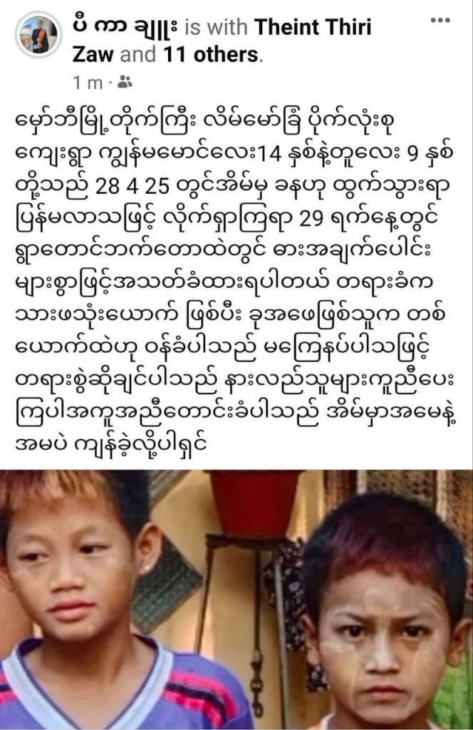 အသက် ၁၄ နှစ်နဲ့ ၉ နှစ်အရွယ် ယောက်ျားလေးနှစ်ဦးကို ရာဘာခြံထဲမှာ ရက်ရက်စက်စက် ဓားမနဲ့ ခုတ်သတ်တဲ့ဖြစ်စဉ် ရန်ကုန်တိုင်းဒေသကြီး၊ တိုက်ကြီးမြို့နယ် ၊ လိမ္မော်ခြံ (ပိုက်လုံးစု)ကျေးရွာမှာ ပြီးခဲ့တဲ့ ဧပြီလ ၂၈ ရက်နေ့က ဖြစ်ပွားခဲ့ကာ လူသတ်တရားခံကိုလည်း နောက်နေ့ ၂၉ ရက်နေ့မနက်မှာ တိုက်ကြီးမြို့မရဲစခန်းက ဖမ်းဆီးရမိခဲ့တယ်လို့ သိရပါတယ်။