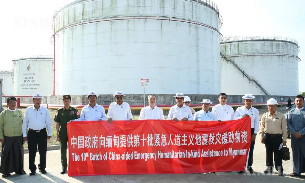 တရုတ်နိုင်ငံက မြန်မာ့ငလျင်ဘေးအတွက် ယွမ်သန်း ၁၀၀ ဖိုး ထောက်ပံ့ကူညီရန် ကနဦး ဆုံးဖြတ်ထားပြီး ပထမအသုတ်အလှူအဖြစ် မတ်လ ၃၁ ရက်တွင် ရွက်ဖျင်တဲ ၁,၂၀၀ လုံး၊ ခြုံစောင် ၈,၀၀၀၊ အရေးပေါ်ကယ်ဆယ်ရေးအိတ် ၄ သောင်းကျော်ကူညီထားပြီး ဒုတိယအသုတ် ကူညီကယ်ဆယ်ရေးပစ္စည်းများကို ဧပြီ ၃ ရက်တွင် ရွက်ဖျင်တဲ ၈၀၀ လုံး၊ ခြုံစောင် ၂,၀၀၀၊ ဘီစကွတ်သေတ္တာ ၃၀၀၀၊ Mineral Water သေတ္တာ ၂,၀၀၀ ၊ ဧပြီလ ၅ ရက် တတိယအသုတ်ပစ္စည်းများတွင် ရေသန့်စက် ၁၀၄၈ စုံ၊ ခြင်ထောင်အလုံးရေ ၁၀၀၀၀ ၊ အရေးပေါ်ဆေးအိတ် ၁၅၀၀၀ နှင့် ရွက်ဖျင်တဲအကြီးစား ၄၀၀ စသည်တို့ပါဝင်ပြီး ဘေးဒဏ်သင့်ဒေသသို့ နေ့ချင်းပို့ဆောင်ပေးမည်ဖြစ်ကြောင်းထုတ်ပြန်ခဲ့သော်လည်း စတုတ္ထအသုတ်ကို ဧပြီ ၉ ရက်တွင် ရွက်ဖျင်တဲ ၁၂၄၈လုံး၊ ခြင်ထောင် ၁၀,၀၀၀ လုံး၊ တာပေါ်လင် ၉,၀၀၀ လိပ်၊ အိပ်ယာအိတ် ၄၀၀၀ ခုနှင့် ထိုနေ့တွင်ပင် ပဉ္စမအသုတ် အကူအညီပစ္စည်းများရောက်ရှိကာ ပါဝင်လာသည်များမှာ ရွက်ဖျင်တဲ ၂၆၆ လုံး၊ ခြင်ထောင် ၂၀,၀၀၀ လုံး၊ တာပေါ်လင် ၉,၀၀၀ လိပ်၊ ခေါက်ဆွဲခြောက် ၂,၀၀၀ သေတ္တာပါဝင်ပြီး စုစုပေါင်းအလေးချိန် ၉၁ တန်ကျော်ရှိကြောင်း သိရသည်။