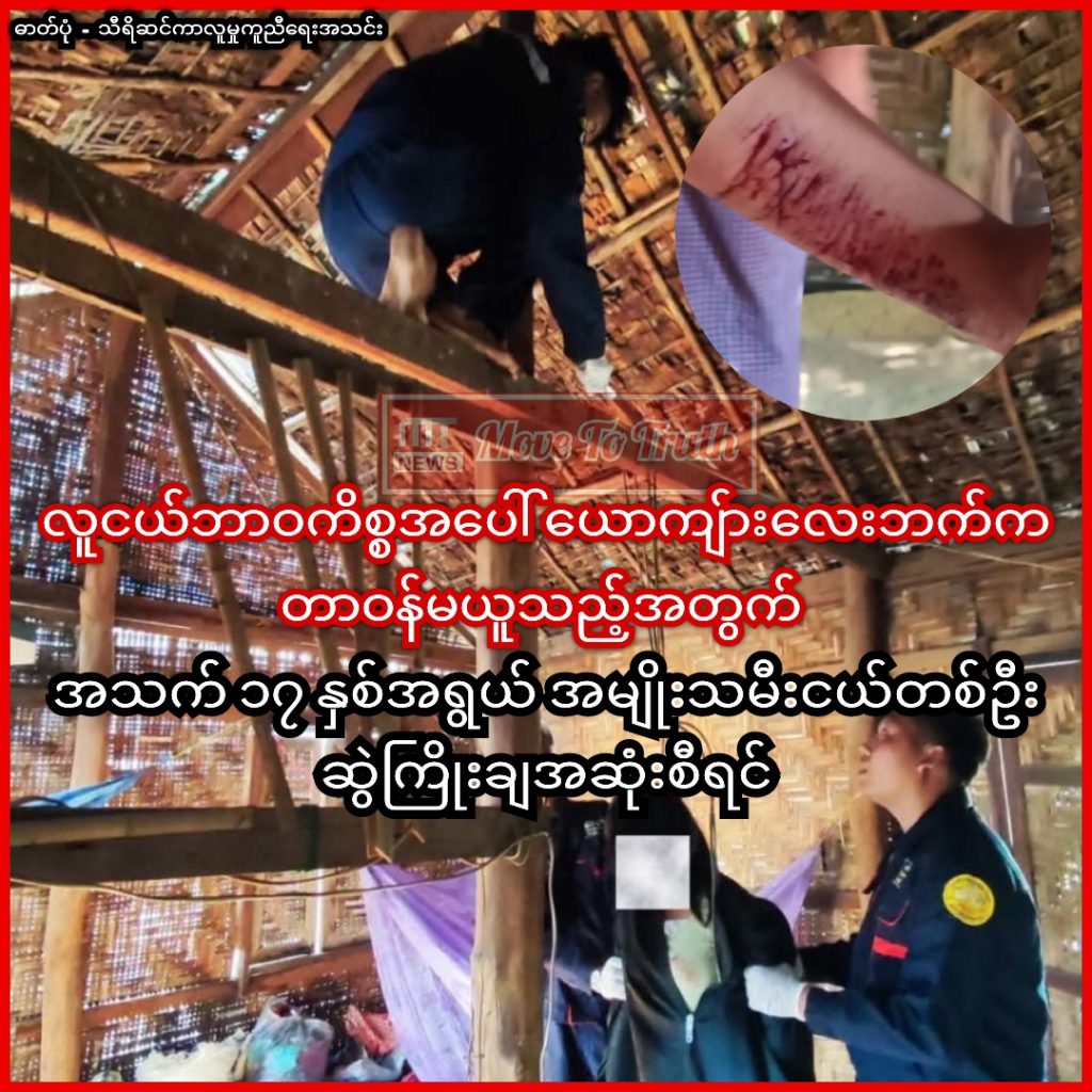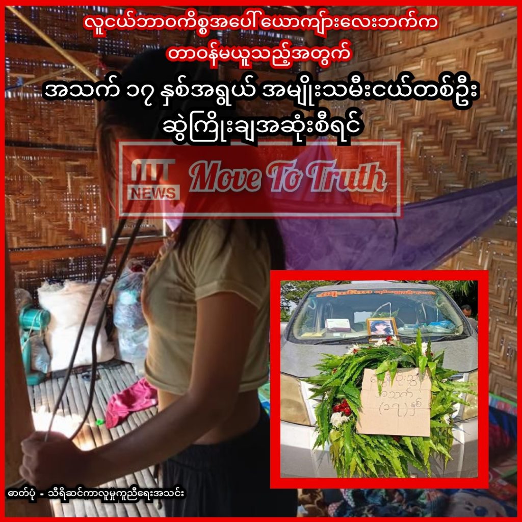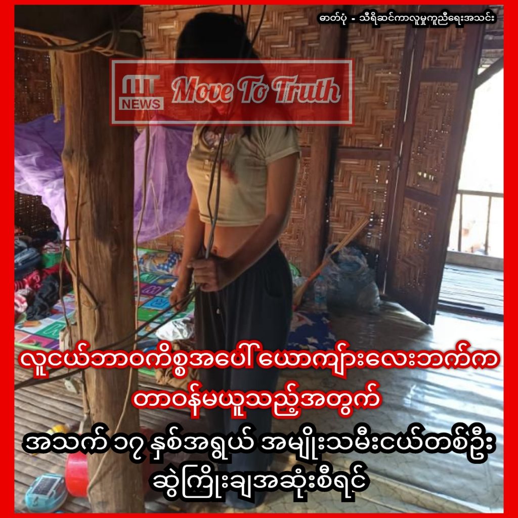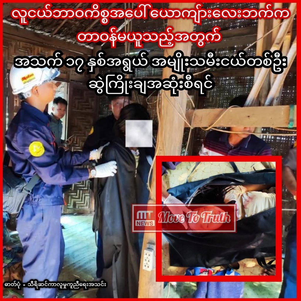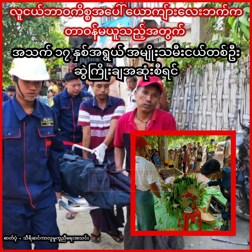 မန္တလေးတွင် အသက် ၁၇ နှစ်အရွယ် အမျိုးသမီးငယ်တစ်ဦး ဆွဲကြိုးချ(ကြိုးဆွဲချ) အဆုံးစီရင်မှု တစ်ခု ဖြစ်ပွားခဲ့ကြောင်း သီရိဆင်ကာပရဟိတလူမူကူညီရေးအသင်းက MT News ကို ပြောသည်။