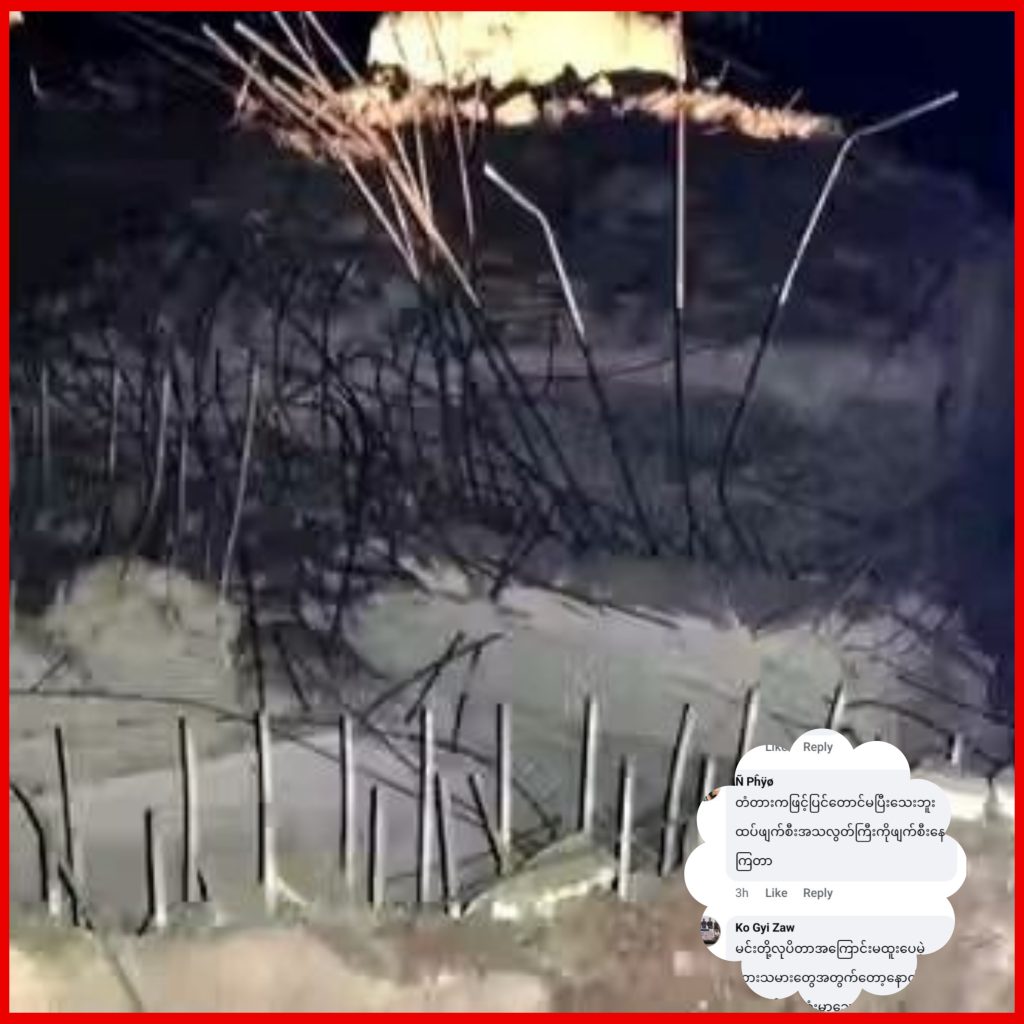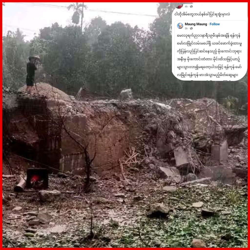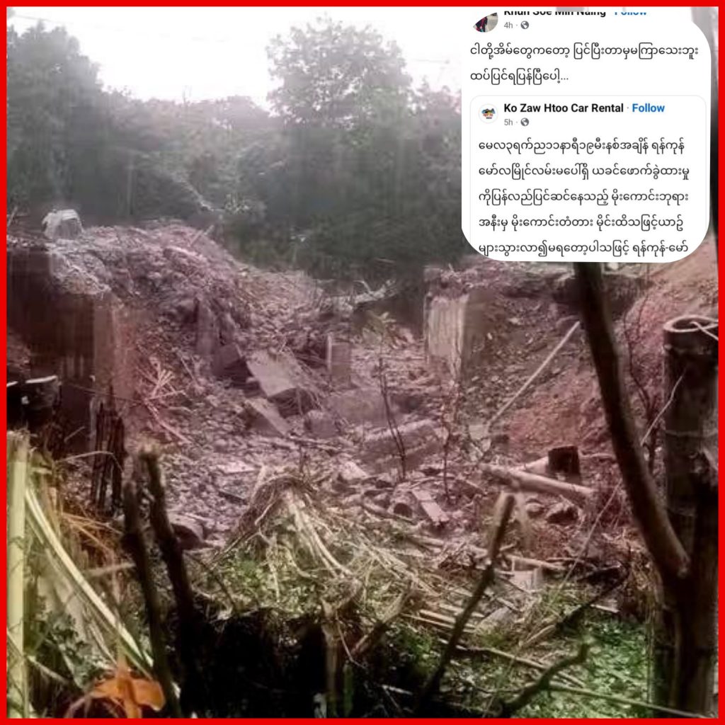 KNU နှင့် PDF များ မိုင်းခွဲဖျက်ဆီးလိုက်မှုကြောင့် အစိုးရက ပြန်လည်ပြင်ဆင်နေသော မိုးကောင်းတံတား ထပ်မံမိုင်းခွဲခံရပြီးနောက် ကျိုးကျပျက်စီးသွားမှုကြောင့် ကုန်ကားကြီးများသွားလာမရသည့် အခြေအနေဖြစ်ပေါ်နေကြောင်း သိရသည်။