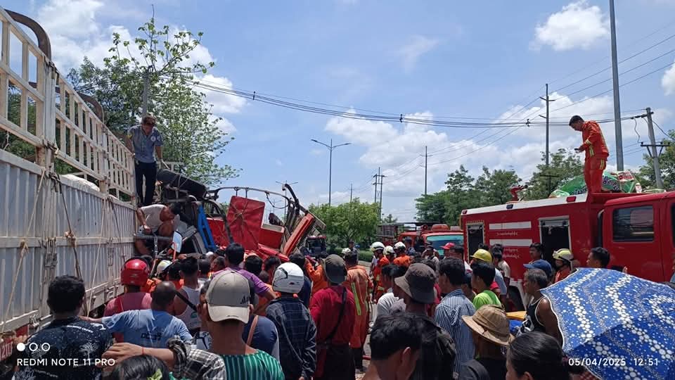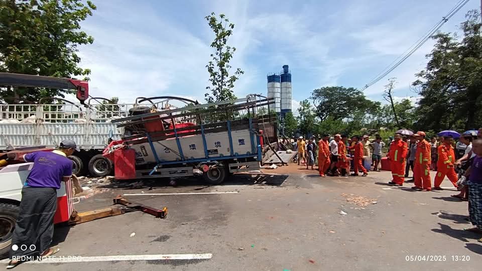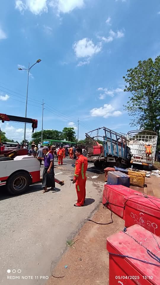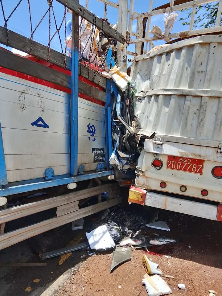 ရပ်ထားသည့် ၁၈ ဘီးယာဥ်ကို ငါးတင် Canter ယာဥ် ဝင်တိုက်ရာက တစ်ဦးသေဆုံးပြီး လေးဦးဒဏ်ရာရမှု ယနေ့ဖြစ်ပွားခဲ့သည်ဟု မီးသတ်ဦးစီးဌာနထံက သိရသည်။