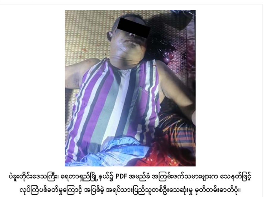 ပဲခူးတိုင်းဒေသကြီးသည် အုပ်ချုပ်ရေးမှူးနှင့် ပြည်သူ အများအပြား သတ်ဖြတ်ခံရသည့် တိုင်းတစ်ခုဖြစ်သလို နွေဦးတော်လှန်ရေးစတင်ချိန်မှ ၂၀၂၄ ခုနှစ် အကုန်အထိ ကလေးသူငယ် ၂၃၀ ကျော်၊ သံဃာတော် အပါး ၉၀ ကျော်၊ ရပ်ကျေးအုပ်ချုပ်ရေးမှူးနှင့် ဆရာဆရာမ၊ နိုင်ငံ့ဝန်ထမ်း ၁၂၀၀ ကျော်အပါအဝင် ပြည်သူ ၁၀၀၀၀ ခန့်မှာ “ဒလန်၊ သူလျှို၊ နစကယန္တရားလည်ပတ်အောင်ပြုလုပ်ပေးသူ” ဆိုသည့် စွပ်စွဲချက်များနှင့် NLD, NUG, PDF, EAOs တို့၏ သတ်ဖြတ်မှု ခံထားရသည်။