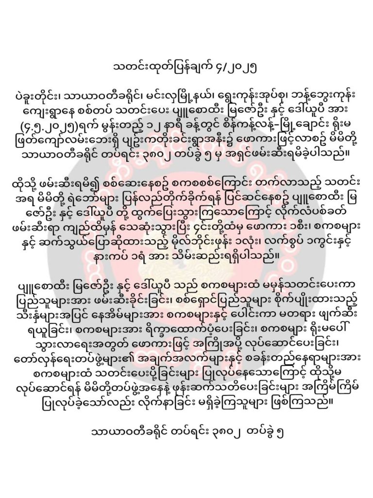 အမျိုးသားတစ်ဦးနှင့် အမျိုးသမီးတစ်ဦးကို သတင်းပေးပျူစောထီးခေါင်းစဥ်တပ်ကာ အရှင်ဖမ်းဆီးလာပြီးမှ ထွက်ပြေးသည် ခေါင်းစဥ်တပ်ကာ သာယာဝတီ PDF က အသေပစ်သတ်လိုက်သည့်အပြင် ကားတစ်စီး၊ ဖုန်းနှင့် ဝတ်ဆင်ထားသည့် ရွှေများကိုပါ လုယက်သိမ်းယူခဲ့သည်ဟု ကျူးလွန်သည့် သာယာဝတီခရိုင် တပ်ရင်း ၃၈၀၂ တပ်ခွဲ ၅ က ယနေ့တွင် ဝန်ခံချက် ထုတ်ပြန်သည်။