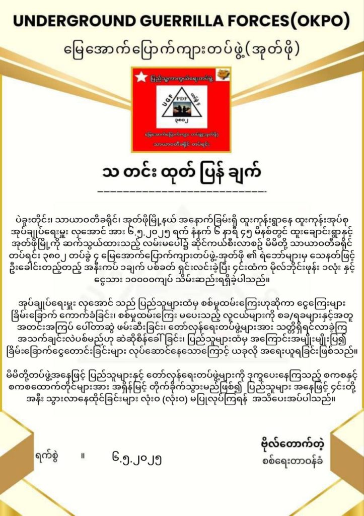 ဆိုင်ကယ်စီးလာသည့် လက်နက်မဲ့ ထူးကုန်းရွာ အုပ်ချုပ်ရေးမှူးကို အုတ်ဖို PDF သတ်ဖြတ်ပြီး ဆိုင်ကယ်၊ ဖုန်းနှင့် ငွေ ၁၀၀၀၀ လုယက်မှု ယနေ့ပြုလုပ်ခဲ့သည်ဟု ကျူးလွန်သည့် သာယာဝတီခရိုင် တပ်ရင်း ၃၈၀၂ တပ်ခွဲ ၄ မြေအောက်ပြောက်ကျားတပ်ဖွဲ့-အုတ်ဖိုက ယခုထုတ်ပြန်သည်။