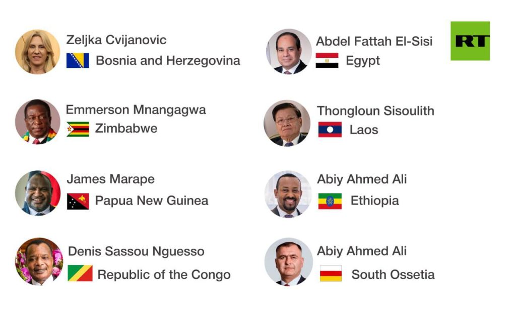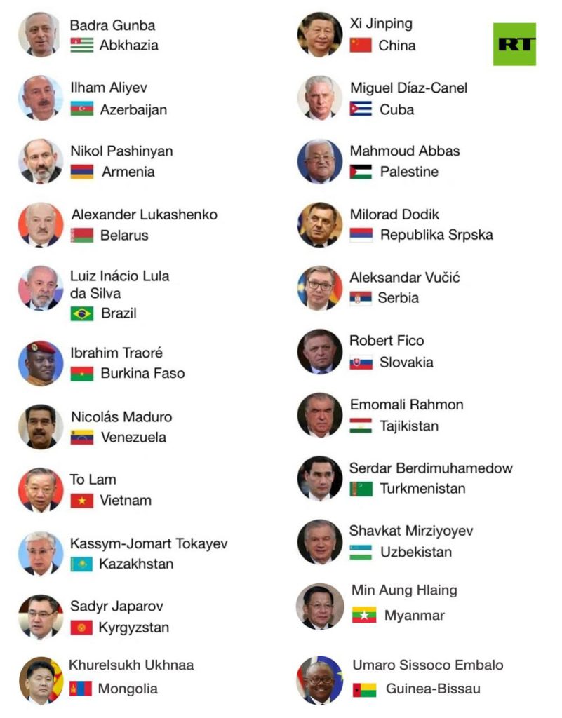 မော်စကိုမြို့၌ မေလ ၉ ရက်တွင် ကျင်းပမည်ဖြစ်သော နာဇီဂျာမနီအပေါ် အောင်နိုင်မှုအခမ်းအနားသို့ တက်ရောက်မည့် နိုင်ငံ့ခေါင်းဆောင်များမှာ လတ်တလောကာလအထိ မြန်မာအစိုးရအဖွဲ့ခေါင်းဆောင်၊ တရုတ်သမ္မတတို့အပြင် အဘ်ခါဇီးယား၊ အဇာဘိုင်ဂျန်၊ အာမေးနီးယား၊ ဘီလာရုစ်၊ ဘရာဇီး၊ ဘူကီနာဖာဆို၊ ဗင်နီဇွဲလား၊ ဗီယက်နမ်၊ ကာဇက်စတန်၊ ကာဂျစ်စတန်၊ မွန်ဂိုးလီးယား၊ ကျူးဘား၊ ပါလက်စတိုင်း၊ ဆက်ခ်ပစ်စကာ၊ ဆာဗီးယား၊ စလိုဗက်ကီးယား၊ တာခ်ဂျစ်စတန်၊ တာ့ခ်မင်နစ္စတန်၊ ဥဇဘက်ကစ္စတန်၊ ဂီနီယာဘီဆော၊ ဘော့ဇနီးယားနှင့် ဟာဇီဂိုဗီနာ၊ ဇင်ဘာဘွေ၊ ပါပူအာ နယူးဂီနီ၊ ကွန်ဂို၊ အီဂျစ်၊ လာအို၊ အီသီယိုပီးယား၊ ဆောက်အိုဆက်ရှား စသည့် နိုင်ငံနှင့် ဒေသ ၃၀ မှ ကမ္ဘာ့ခေါင်းဆောင်များ တက်ရောက်မည်ဟုလည်း သိရသည်။