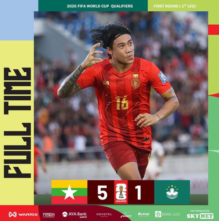 MT News 作为2026年世界杯预选赛首轮比赛,缅甸国家队与澳门国家队将于10月12日下午4点在仰光交锋。缅甸队在苏瓦纳体育场比赛时以一球获胜。 缅甸队在主场轻松迎战澳门队,但比赛第43分钟由Lwin Moe Aung 进球取得领先。随后,比赛第55分钟,虎尾尼奇为澳门队扳平比分,但比赛第62分钟,Soe Moe Kyaw取得领先。第81分钟,Aung Kaung Mun 打进第三球。第91分钟,尼莫·奈恩打进第四球,第94分钟,Nay Moe Naing 打进第五球,赢得了比赛。 2026年世界杯预选赛缅甸国家队与澳门国家队将于10月17日再次进行世界杯预选赛首轮比赛。 缅甸国家队与澳门队的比赛开始前,国家队球员受邀前来助威,不少球迷也来到球场支持。
