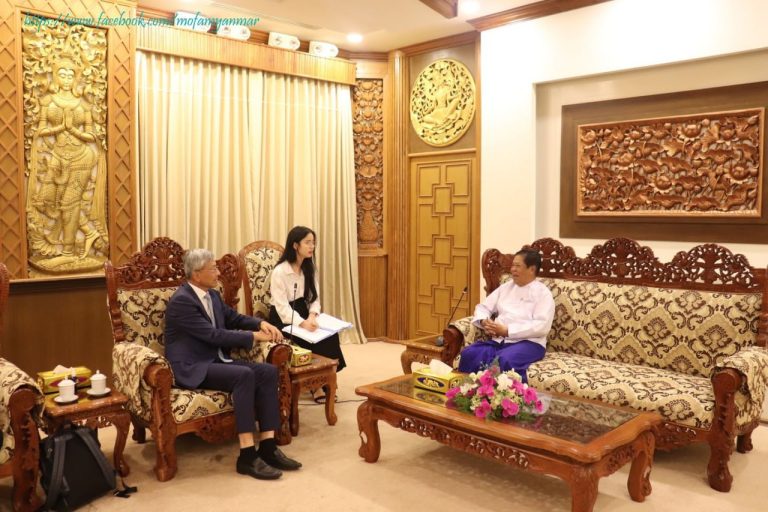 MT News 缅甸联邦副总理兼外交部长吞瑟先生于2023年11月13日晚上6点,在内比都外交部接见了中华人民共和国驻缅甸大使陈海先生。在会谈中,双方热情交换了在促进双边关系、在缅中边境地区维护和平、稳定和法治合作等事务上的意见。