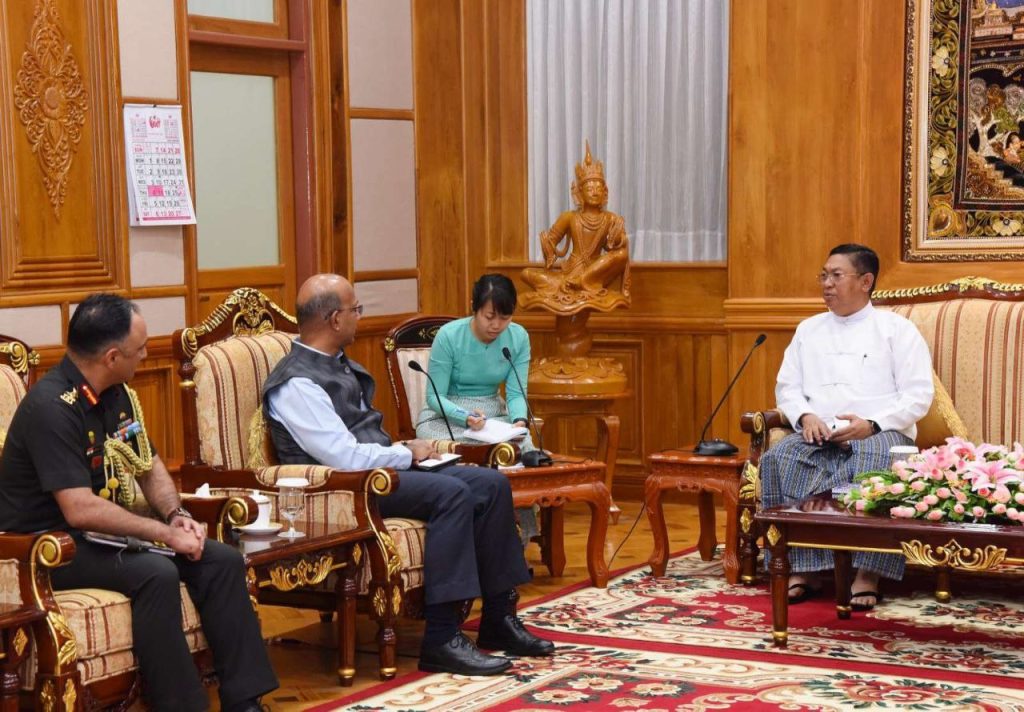 国家安全顾问联盟国家行政委员会主席办公室部长(四)莫昂海军上将在缅甸联邦共和国接待厅接见印度共和国驻缅甸联邦共和国大使维奈·库马尔先生率领的代表团1月17日下午,在内比都国家行政会议办公室。