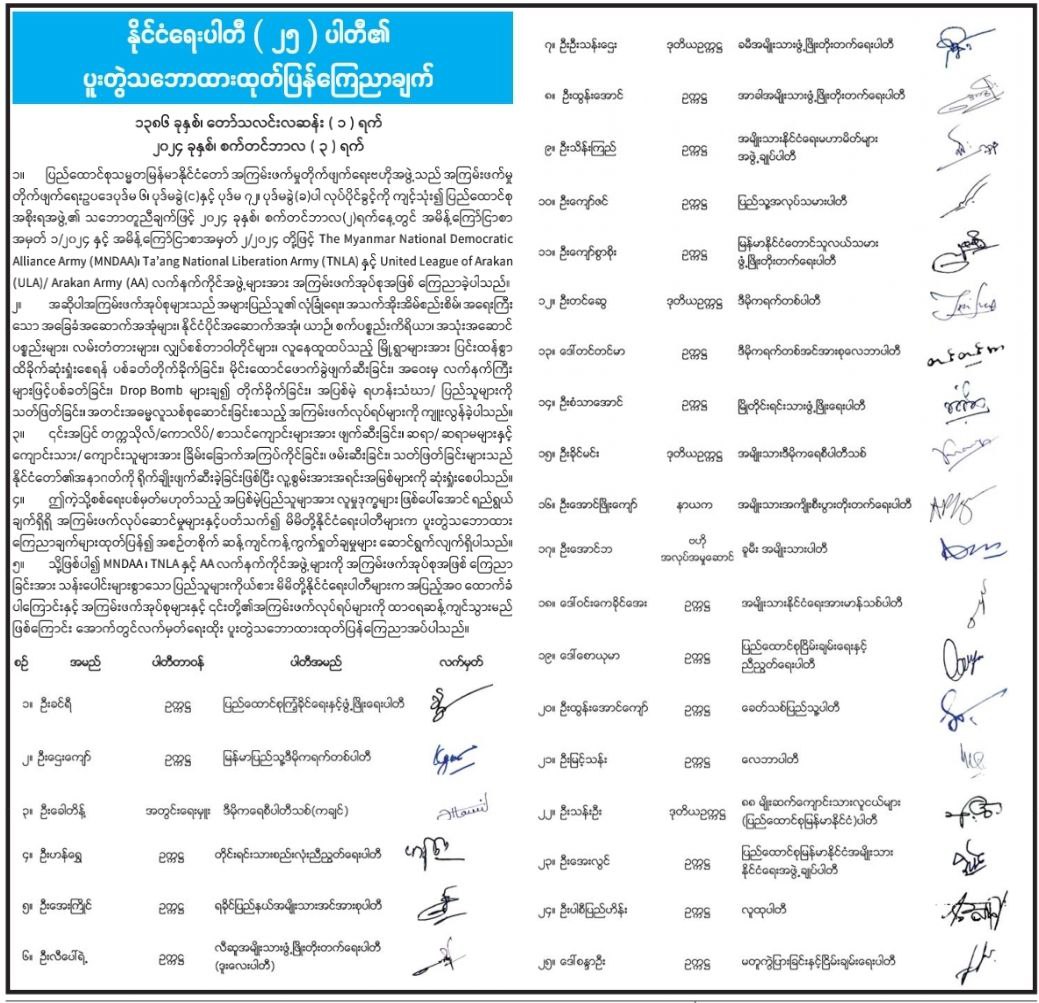 缅甸25个政党联合签署声明,表示完全支持将缅甸民族民主同盟军(MNDAA)、德昂民族解放(TNLA)和若开军(AA)宣布为恐怖组织,因为这些组织故意针对无辜平民进行恐怖杀戮,制造社会动荡。