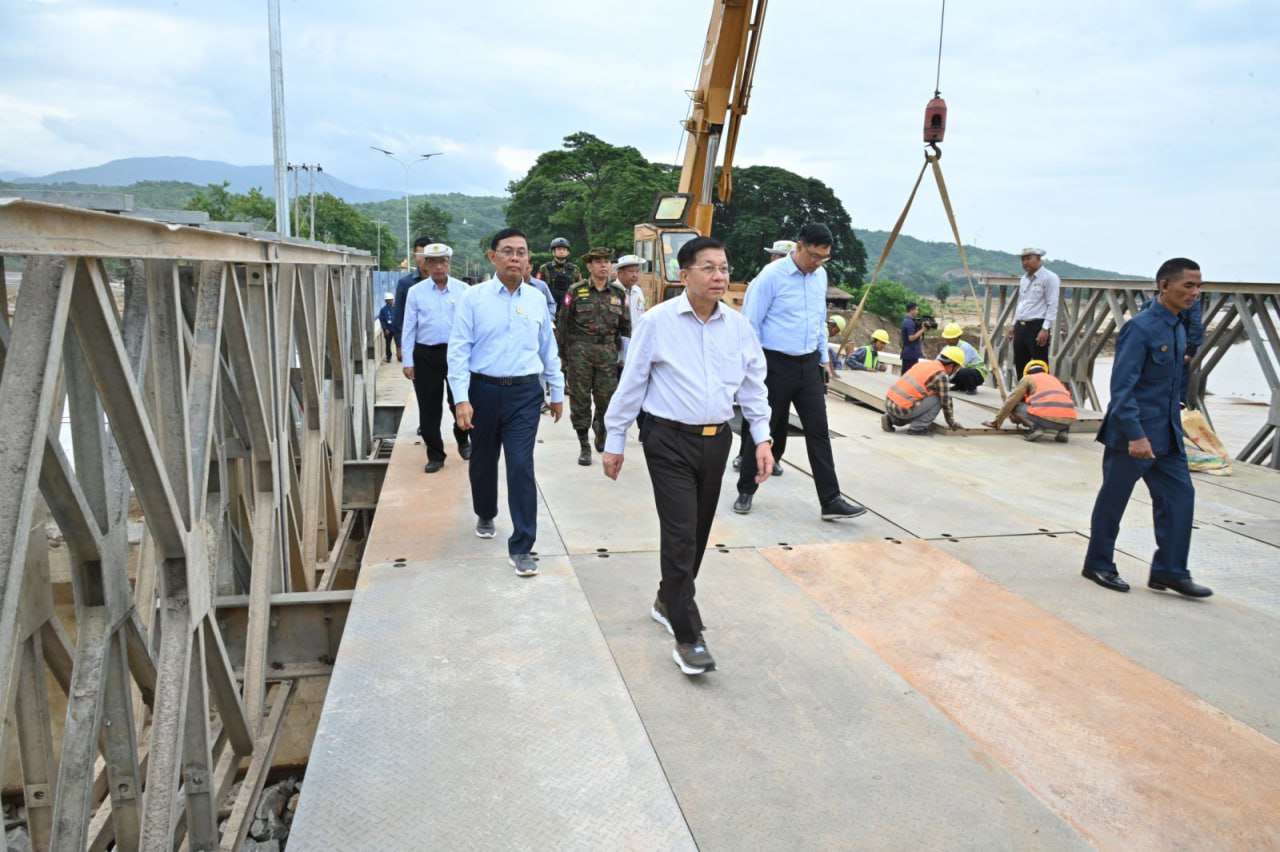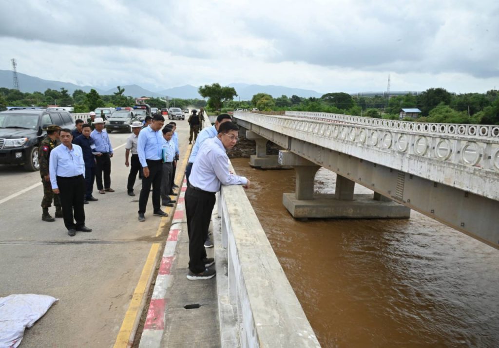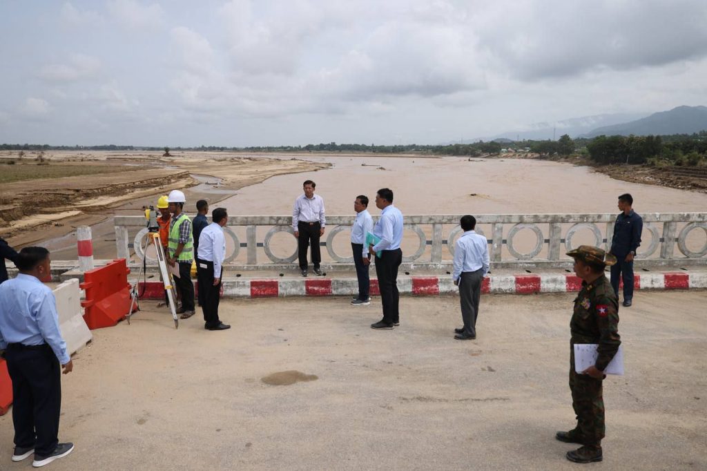 国家管理委员会主席及相关负责人视察了仰光-曼德勒旧路沿线因河水侵蚀而受损的路段,并观察了大货车和客车等待通行的情况。此外,主席还视察了正在修复的纳温溪桥(Asone),该桥正在使用临时贝利桥进行重建。