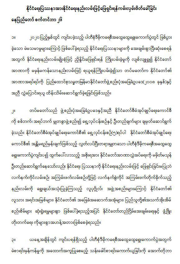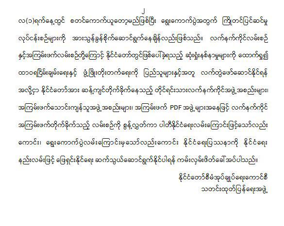 - 为了即将举行的多党民主大选,支持选民登记的全国人口普查工作将于10月1日开始,目前正全力推进选举的筹备工作。鉴于武装冲突和恐怖活动造成的损失,为了实现永久和平与发展,军方邀请所有武装少数民族组织、恐怖分子和PDF组织放弃武装斗争,转而通过政党政治或选举途径解决政治问题,与国家携手共进,实现共同发展。