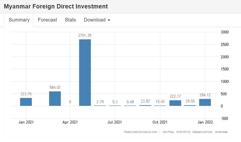 由于 新冠肺炎大流行和政治动荡,缅甸的外国直接投资已经下降。 2018-2019 财年流入缅甸的外国直接投资超过-41.58 亿美元,2019-2020 财年超过-48.8 亿美元,2020-2021 财年超过-37.91 亿美元,2019 财年超过-6.41 亿美元 过去六个月的小预算期(2021 年 10 月至 2022 年 3 月)和 2022-2023 财年超过-12.3 亿美元。
