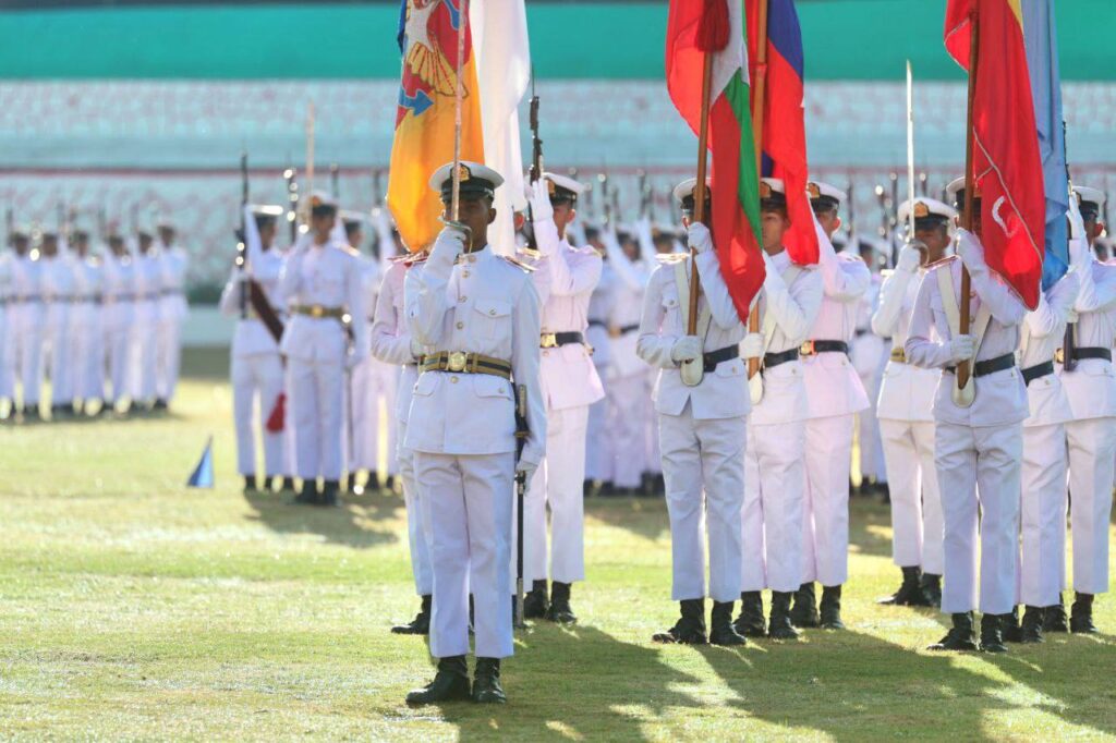 上将向学员连队致敬,并为第35035号学员Tun Lin Kyaw颁发最佳学员奖,为第350422号学员Nay Lin Soe颁发培训优秀奖,向学员颁发学习(艺术)优秀奖 第 34985 号学员 Zwe Nyi Min Paing、第 35214 号学员 Myo Min Aung 的学习优秀奖(科学)和第 35224 号学员 Thu Rein Soe 的学习优秀奖(计算机科学)。接下来,高级将领在第 64 届国防学院毕业典礼上发表了详细讲话。 随后,上将在接受了学员连队的敬礼后离开了阅兵式。阅兵式结束后,上将在国防军司令部会客厅接见了五名优秀学员并致辞。