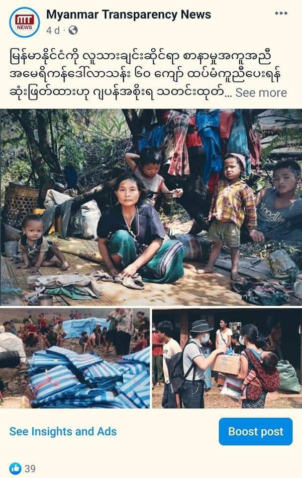 2021年后,已向缅甸提供4700万美元的日本准备再次向缅甸提供6000万美元作为人道主义援助,他们说这笔钱将由联合国难民署使用, 联合国儿童基金会 世界粮食计划署 AHA 中心提供帮助。