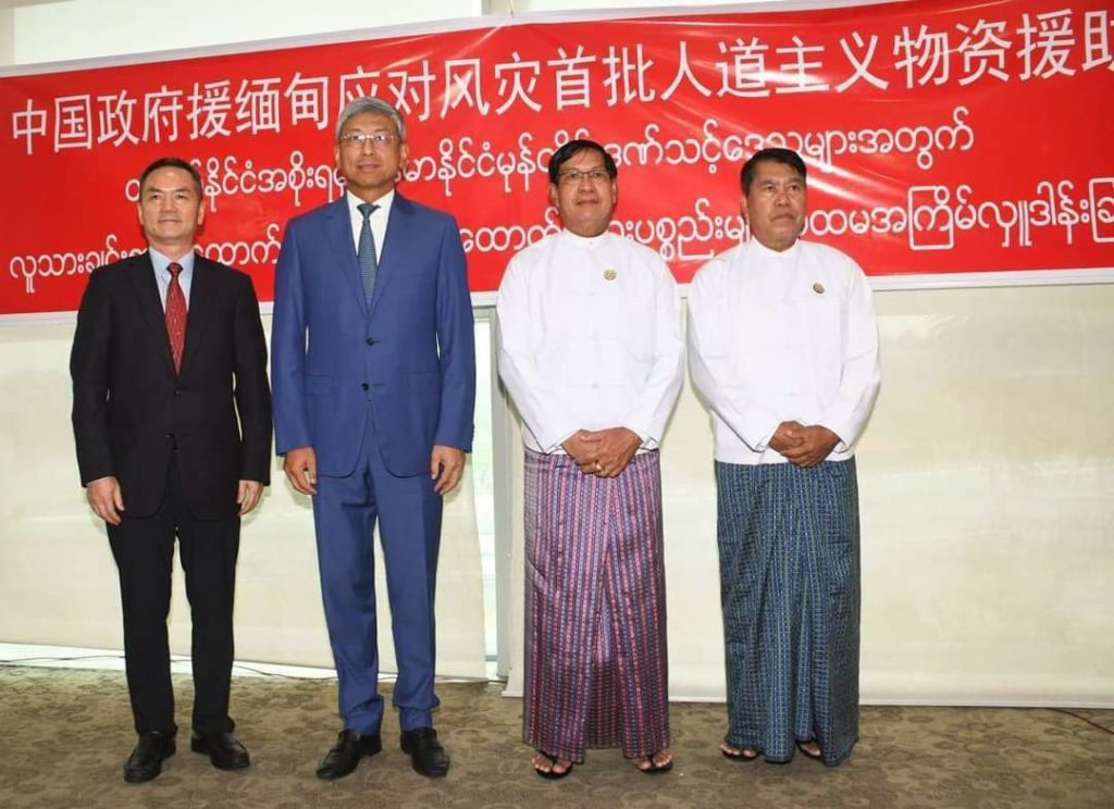 中国驻缅甸大使馆宣布 中国捐赠的项目包括净水片, 水泵,食物, 还有一种易于携带的发电机 并将于近期海运。