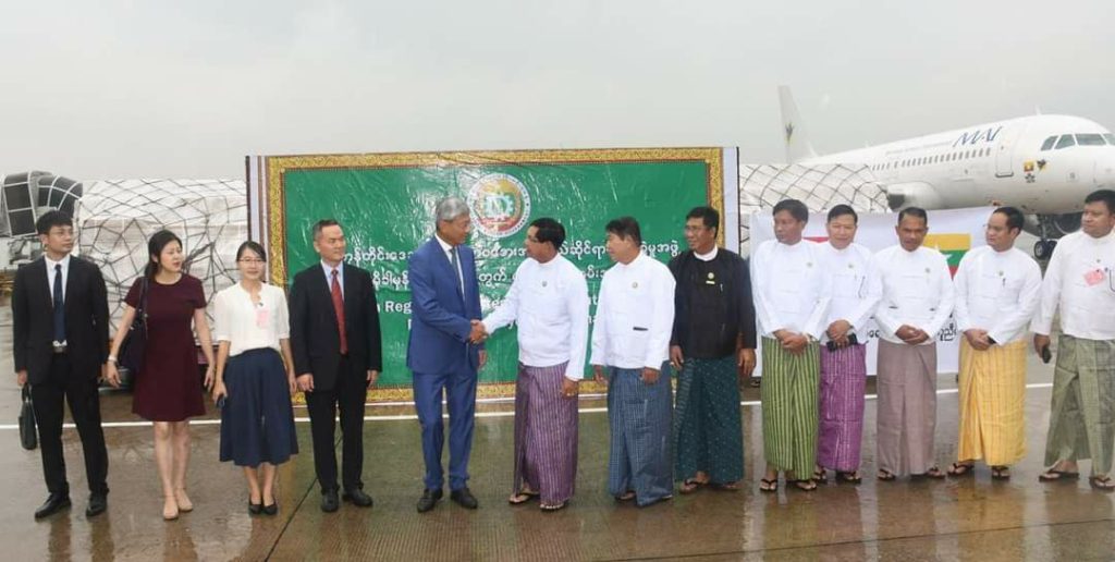 中国驻缅甸大使陈海阁下在空侧将抵达的物资移交给仰光地区首席部长、仰光地区灾害管理委员会主席吴梭登 U Soe Thein.
