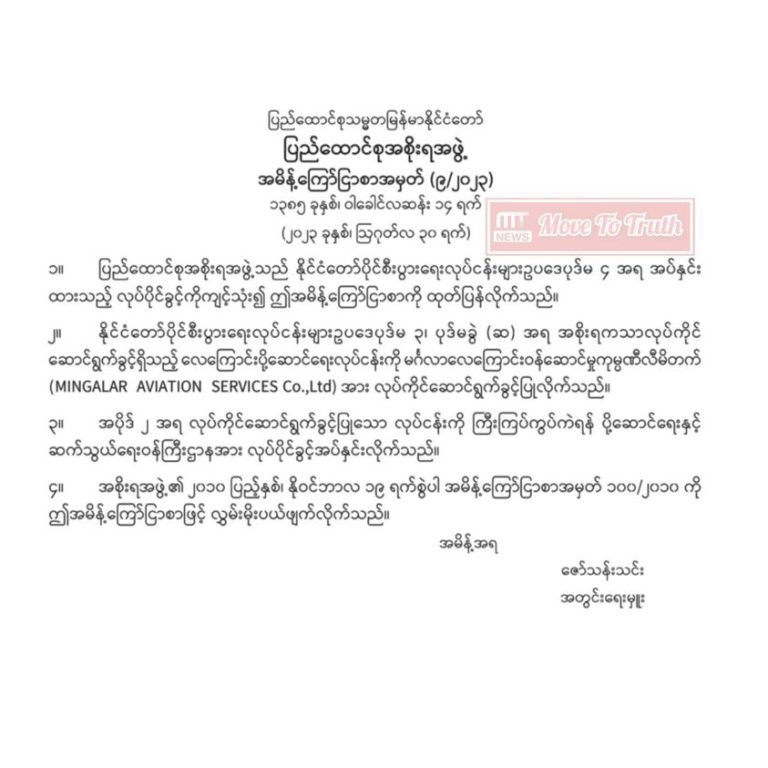 7 October 2023 Mingalar Aviation Services company was allowed to operate the air transportation business which only...