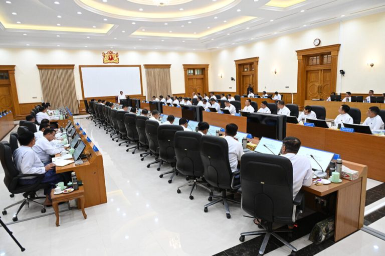 Accompanied by SAC Secretary General Aung Lin Dway, Union Minister U Myo Thant and officials, the Senior General examined the slight damages caused by the earthquake at the ceiling at the entrance of the main hall of MICC-I, the ceilings of Jade Hall, Ruby Hall, and Emerald Hall and and minor damages of the walls of meeting rooms and gave directives.