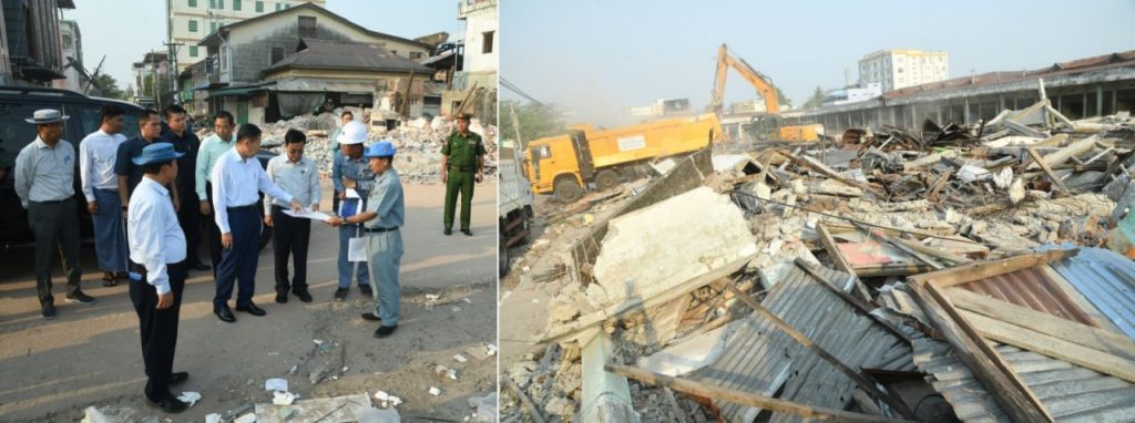 First, the Vice-Senior General, and the entourage inspected the collapsed buildings in Market Halls A and B of Myoma Market No. (1), which were severely damaged by the Mandalay earthquake and subsequent tremors. They observed the clearance operations being carried out by military person-nel, joint teams, and volunteer groups. They also examined the structural stability of Market Halls C and D, which suffered minor damage, operating with Tex exemptions, and provided guidance to the responsible officials.